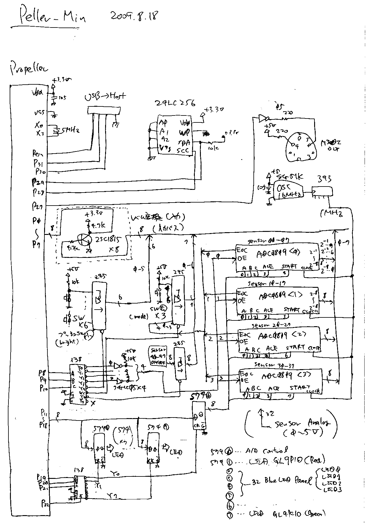 また、「Peller-Min」を使った作品「controllable untouchableness」のパフォーマンスの記録(YouTube)は、 2009年のインカレ併催の「親父の背中」コンサートでの記録が これ と これ であり、2010年のMOM2010のライブコンサートでの記録が これ と これ と これ である。 この2つのコンサート(リハ)の写真は、 ここ と ここ にある。製作の風景は、 ここ にあるだけであった。 回路図とかは公開していなかったようなので、かなりの時間をかけて発掘して(^_^;)、スキャンして以下に置いた。 技術資料はこれで全てである。