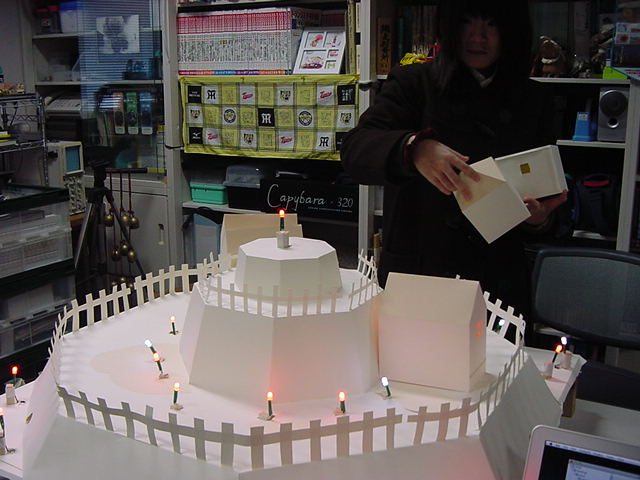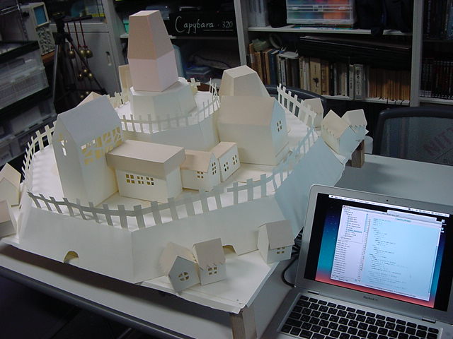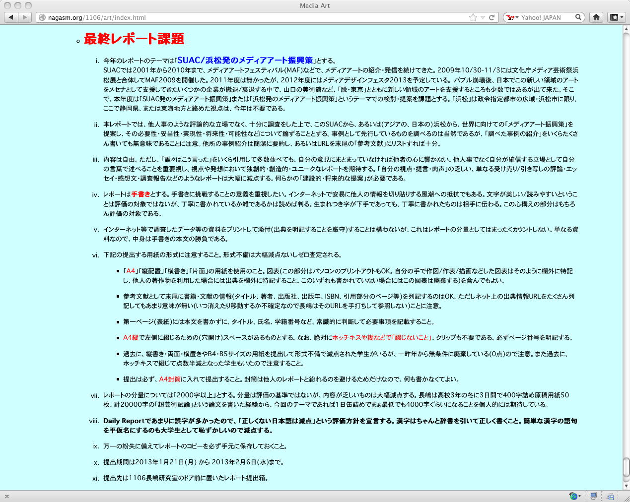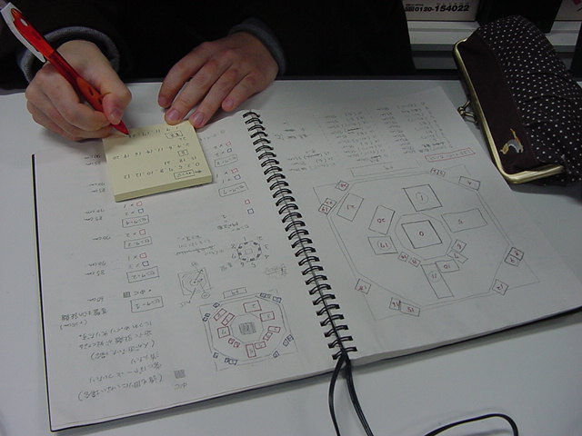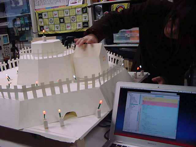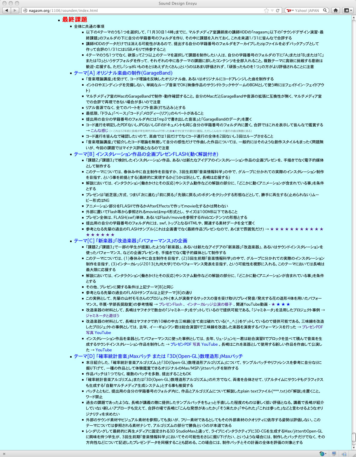 前回の日記からもう1週間である。サボッていた訳ではないが、Propellerはまったく進展していない。 頑張ったメディア造形4回生の卒業制作最終合評があり、毎年恒例の打ち上げが今年はちょっと延びて(^_^;)、 帰宅したのはたぶん金曜日の午前3時過ぎだった程度である。 そして土日はセンター試験の監督を今年は2日間とも担当して立ち続け、ヘトヘトになった。月曜日には瞑想空間では、M2の伊熊さんが こんなふうに 口頭試問のための記録などを頑張っているのを見届けた。 さらに半日かけて、以下のように、後期いよいよ終盤となった芸文専門科目「メディアアーツ論」の最終レポートと、 メディア造形専門科目「サウンドデザイン演習」の最終課題を作ってWebに置いた。