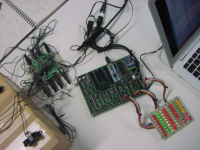 昨夜もまた、12時間睡眠をとった。月曜日から、18時間・12時間・12時間と寝て、 遂にようやく、治った(^_^)。 今日は午後3限に学科会議、4限に学部教授会と大学院教授会、そして5限に佐藤先生が研究室に来て、 望月さん作品の検収を行う予定であり、午前中に成績処理とか色々な事務を行う予定である。昨日の3限に望月さんが研究室に来て、上記の写真のような状況で、一応のPropellerプログラムを確認した。 8つの距離センサに対して24個のLEDを反応させる、というところまではOKとなったが、あと一つ、 「センサからLEDの反応までに約1秒の遅れが欲しい」という条件だけが残った。 そこからしばし、ベストでない体調でプログラミングに挑んだが、結論として、これはPropellerで簡単に30分ほどで出来るものでは無い、 と結論付けて、時間的制約から今回の作品については、MacノートのMaxが登場することになった。 Maxを使えば、センサからの入力を「pipe 1000」というオブジェクト1個で簡単に遅延させることができて、 実際にこれで希望する動作は完璧に実現できた。