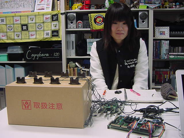 この「靄夜」システムのAKI-H8プログラムをそのまま活用したのが、 去年の院生・見崎さんの修了制作のインスタレーション作品「OTOcakecco」である( プレゼン・ YouTube )。 ここでは3層に各7個、計21個の球体(ドレミの7つの音階に対応)があり、 それぞれの球体に3色LEDが内蔵されてフルカラー表示を行う。 つまり全ビット数は21*3=63個、とちょうど64個の「靄夜」システムとぴったりだったのである(^_^)。 そこで、24チャンネル(21個+予備)の衝撃センサ回路のためにさらに別にAKI-H8を搭載して、 ★ ★ ★ ★ ★ ★ ★ ★ ★ ★ ★ ★ ★ ★ ★ と制作していったのだった。