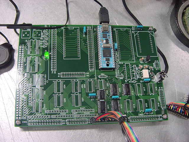 そして以下のように、たった「33ワード(longs)」という短いプログラムが出来て、 ポート入力の動作を確認した。 ディジタル入力ではお約束のpull-upによって、GNDとショートするスイッチ入力の論理は負論理となるので、 ビットを反転するのに「$FF」とXOR(排他的論理和)をとっているのが、定番のテクニックである。 1ビットだけ、例によってミニフラットパッケージのハンダ不良らしいビットを発見したので、 またまたフラックスとハンダにより、無事にこちらのチェックも終了した。
