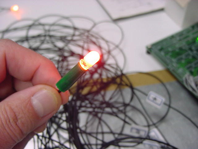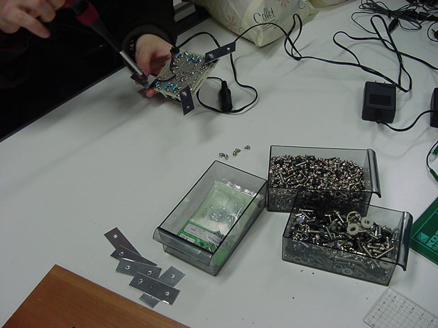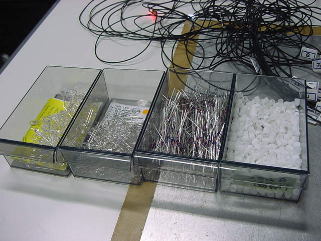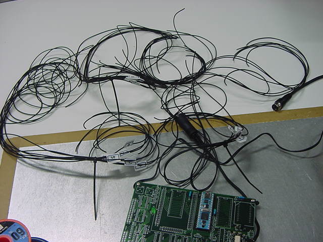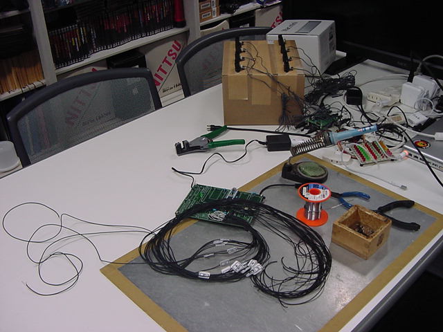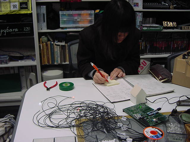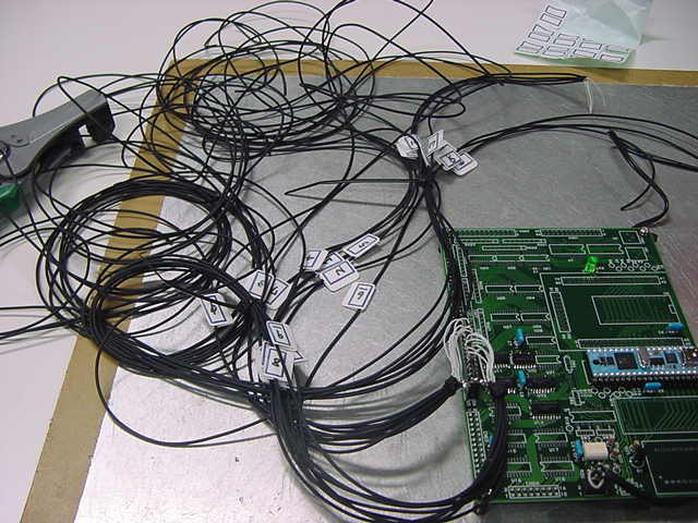 そして午後になって、いろいろ設計ノートを書き込んできた望月さんが研究室に来た。 まだ午後イチの段階でLEDの納品が無かったので、24本のLEDまで行くシールド線をそれぞれの長さまで切る、 という作業をしてもらった。 その後、秋月電子からの正午の便で着いた、ということで業者がLEDを納品してきたが、 造形に没頭しているらしくメイルに返信が無かった(^_^;)。 そして、基板コネクタ側を配線していて発覚したのは、24本の筈のシールドの21番だけ無い、ということで、 この日の作業はここまでとなった。 次は日曜日か月曜日である。果たして完成するのかどうか。 2013年1月28日(月)