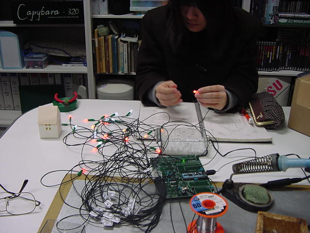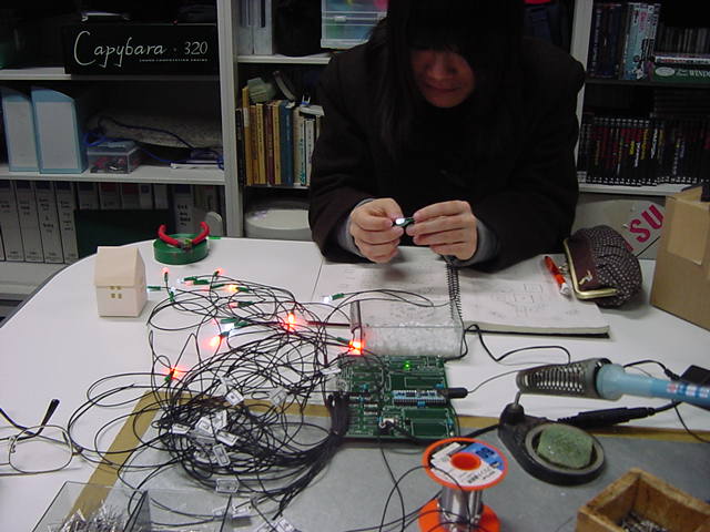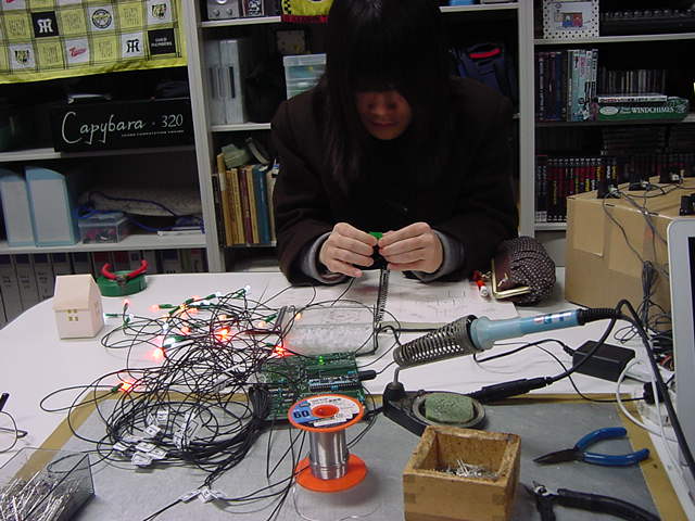 いよいよ、メディア造形3回生の「総合演習I」の最終合評が週末の金曜日に、そして僕の水曜日の2つの講義も最終日となる。 しかし、去年の年末に遭遇したのと似た、「お腹に入る風邪」っぽくなり、急遽、放課後のアカペラの中止をメンバーに連絡して、 午後には早々に帰宅して明日まで寝て治すことにした。 午前中にはモーショングラフィクス作品の3回生・大山クンのアポがあったが、作曲した音楽はともかく、まだ映像が完成していなかった。(^_^;)そして午後には望月さんが来て、以下のように24個のLED(橙色・黄色・白色)を繋ぐ、という作業だけやっつけた。 明日の午後までには全ての造形を完成させて持ってきて、いよいよ肝となるPropellerのプログラミングである。 僕もそれまでに、ひたすら寝て回復して、プログラミングできる体調に復活している必要がある。