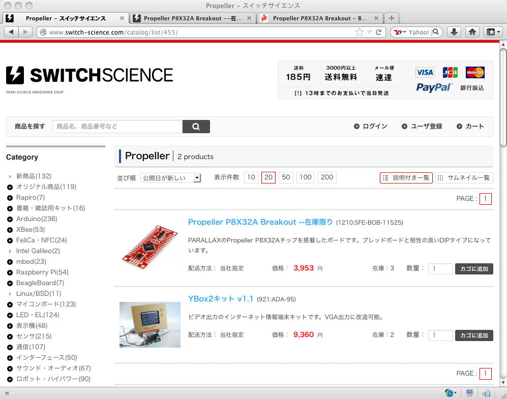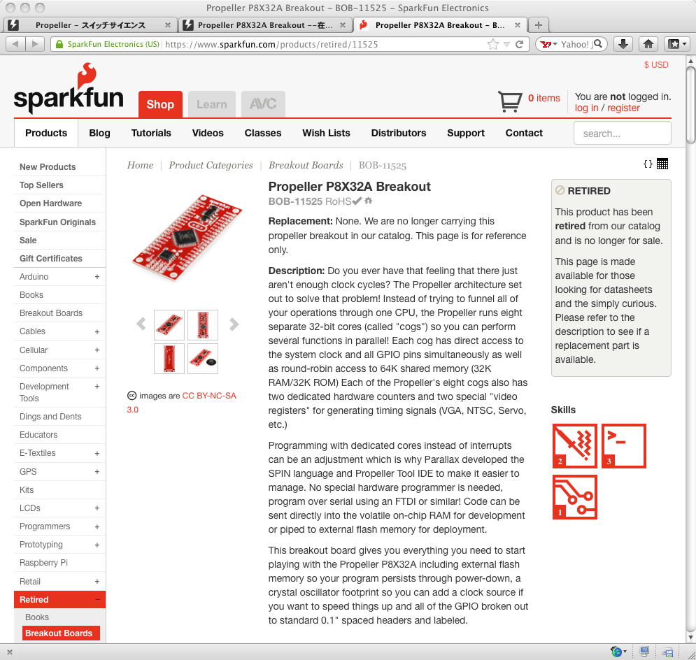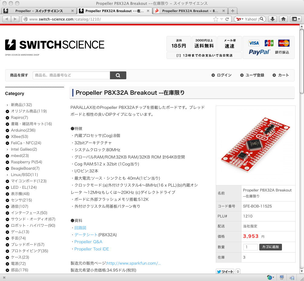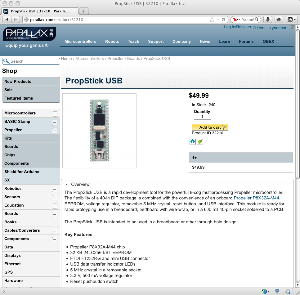 ところが、今日フト見てみると、なんと上の Parallax のサイトで、いつも活用してきたPropStickが「在庫240個」と復活していたので、さっそく補充用に発注した。