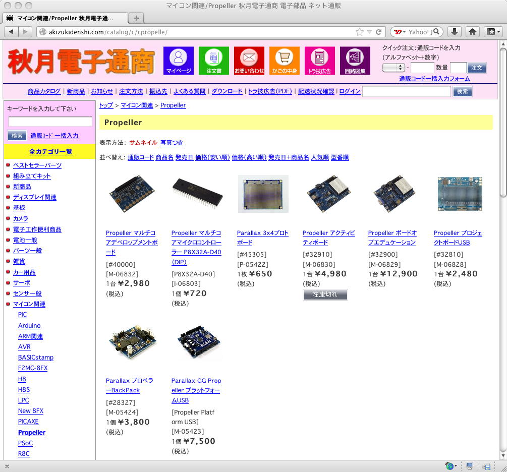 そしてなんと、上のように、 秋月電子 の「マイコン関連」ページにも、「Propeller」が登場していたのである(^_^)。 PropStickを取り扱ってくれればbestだが、まずは「秋月でもPropeller」という事実が、なんとも心強い。