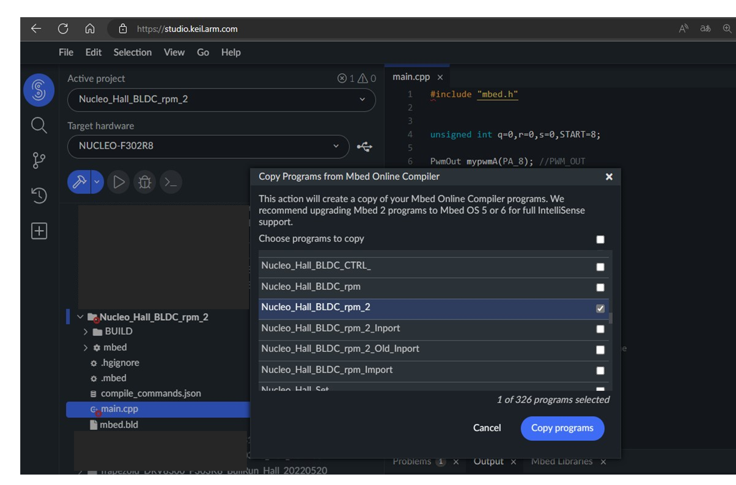 図1の「Copy Program from Mbed Online Compiler」ダイアログ・ボックスが現れます.Mbedオンライン・コンパイラのプログラム一覧が表示されます.移動したいものにチェックを入れます(複数選択可).
