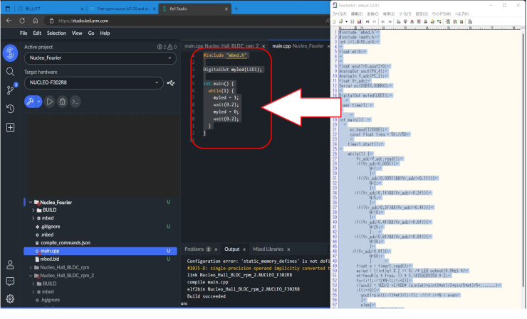 ソースコードにエラーがないことを確認します.後は,図2を参考にNucleo_F302R8を選択してからコンパイルすると,binファイルがダウンロードされます.