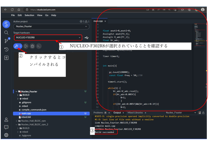 Target Hardwareは自動で選択されますが,Nucleo_F302R8であるか確認してください.図2の②の部分をクリックするとコンパイ