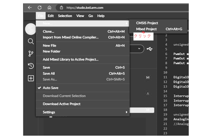 Keil Studio Cloudで,[File][- New][- Mbed Project]をクリックします(図3).ちなみに[Mbed
