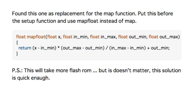ちなみに、入力周波数がfloatであるものの、元々カウンタを使ったArduino Nano[1]のスケッチからはintのデータが入ってくるので、小数点以下までの精度の周波数とするには、整数のみ対応しているmap()関数をfloatにする必要がある。 ところがちょっと調べてみると、ちゃんと ここ に、以下のような美しい方法が出ていた。