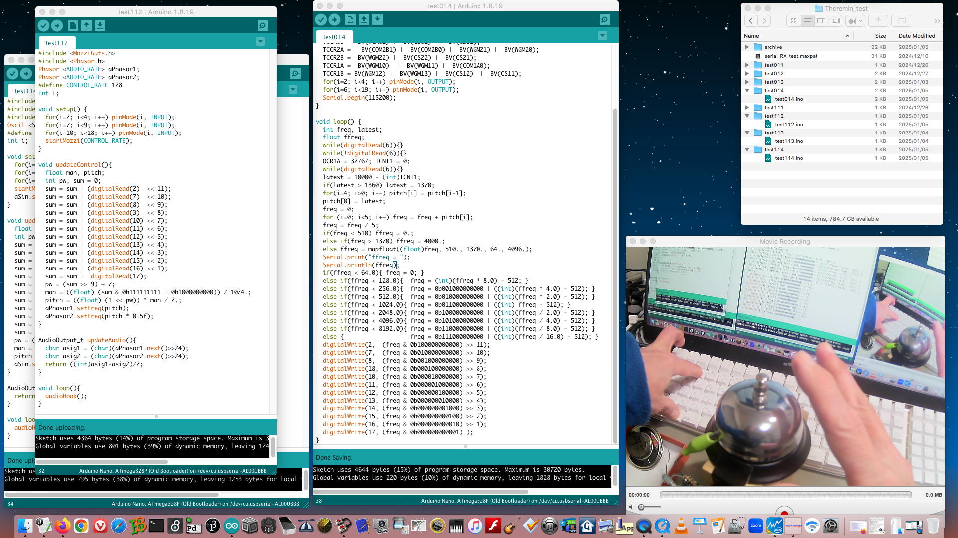 これで準備は出来たので、さっそくArduino Nano[1]での実験を開始した。 ここまで動いていた最新のスケッチは「test013.ino」(5段の移動平均処理まで)である、と確認した上で、新たに「test014.ino」でスタートである。 繋がれたArduino Nano[2]は何かヘンな音を出すかもしれないが、アンプのボリュームを絞って当面は無視することになる。