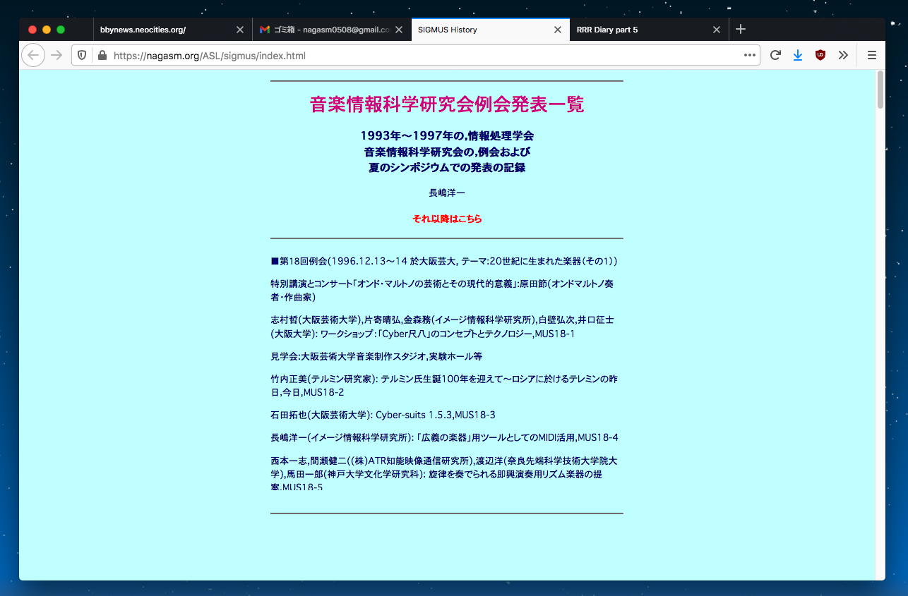 自分が この記録 に載せていた「第18回例会」で、竹内さんが「テルミン氏生誕100年を迎えて〜ロシアに於けるテレミンの昨日」という発表と共にデモ演奏していた・・・という指摘を受けて発掘してみれば、なんと僕も同じこの研究会で発表していた。 しかし当時は、おそらくオンドマルトノのコンサートやイメージラボでやっていた「サイバー尺八」や大阪芸大見学ツアーなどの印象の陰に隠れていたためか、僕にとって竹内さんは「どこかでお会いしていたような・・・」という存在でした、という、とても失礼な失態をしでかしていたのだった(^_^;)。 まぁ、改めて正式にお会いしてお話して、新しいプロジェクトがスタートしたので、全ては結果良しとしよう。