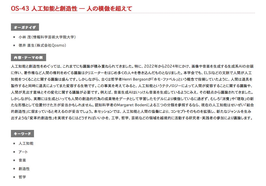IAMASの小林茂さんから去年の暮れ(12/28)にMACS-MLに届いていたのは、「2025年5月27日から30日まで、大阪国際会議場+オンラインで2025年度 人工知能学会全国大会(第39回)が開催されます。この機会に、徳井直生さん(Qosmo・Neutone)と共同でオーガナイザーを担当するセッション『人工知能と創造性 ― 人の模倣を超えて』を提案いたしました」というもので、「昨今のAGI(汎用人工知能)に関する言説を読むにつれ、人間という生物の知的な能力をintelligenceという尺度のみで測ろうとすることの危険性にはあらためて自覚的であるべきだと思えてきます。だからこそ、人工知能と人間の協働により、コンセプトそのものを拡張し、新たなジャンルを生み出すような『変革的創造性』を実現するにはどうすればいいかという議論の重要性は、セッション提案時からさらに増していると感じております」・「芸術、工学、哲学などの領域を越境的に活動する研究者・実践者の参加により議論したいと考えておりますので、該当する活動に取り組んでいる方は、ぜひご応募ください」という素晴らしい企画だった。 流石に即応できない重要テーマなのでGmailの「保管倉庫」に入れて温めていたのだが、(やや言い訳がましいが)もろもろの事情から、無理矢理にこじつけた内容での無理矢理な発表応募については断念バーグする、と決めた。 ただし、もしかするとオンライン聴講するかもしれない。