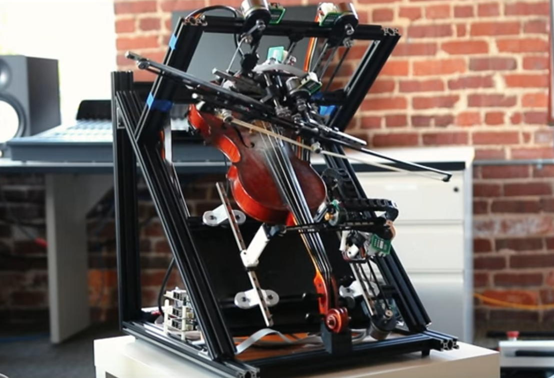 本家MakerのMLからは、最近の色々なMakerたちの活動が紹介されたが、その冒頭にあったのは、上のようなGeorgia Tech College of DesignのRaghavasimhan Sankaranarayanan氏の「インド音楽を演奏するバイオリンロボット」だった。 YouTube動画 を見てみると、バイオリン演奏の「命」とも言えるビブラートは皆無で、さらにスタカートやアタックといったバイオリンの大きな魅力も全て捨象した上で、インド音楽のサーランギのようなサウンドに特化したものだった。 これはこれで素晴らしい味がある。