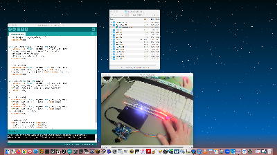 この最終版のYouTube動画(見た目はほとんど変わらない)はまだ撮っていなかったようだが、1日に何度も、「スタンド付きWebカメラを棚から出して、USBハブに挿して、デスクの上を撮影用に整えて、QuickTimePlayerX を起動して Movie Recording ないし Screen Recording を選択して、一発撮りで録画して、YouTubeにアップロードして、いくつもの動画オプションをOFFにして、最後にここにURLをコピペする」という単純作業を再び繰り返す気にはならないので、もし今後、気が向いたらやってみて、この下にでも追記していこう。#include <FastLED.h> #define LED_PIN1 13 #define LED_PIN2 12 #define NUM_LEDS1 31 #define NUM_LEDS2 23 CRGB leds1[NUM_LEDS1],leds2[NUM_LEDS2]; int i, musicScale[] = {523,587,659,698,784,880,988,1047}; int volume_value, gate_time = 10000, sw_old[] = {1,1}, sw_new[] = {0,0}, sw_eve[] = {0,0}; int timing[] = {0,0,0}, points[] = {0,0}, target, led_step = 2, vectors = 1; void setup() { for(i=9; i<11; i++) pinMode(i, INPUT); for(i=0; i<9; i++){ tone(11, musicScale[i]); delay(40); noTone(11); delay(60); } all_black(); sw_old[0] = digitalRead(10); delay(200); } void loop(){ volume_test(); if(++timing[2] > 50){ timing[2] = 0; sw_new[0] = digitalRead(10); if(sw_new[0] != sw_old[0]){ sw_old[0] = sw_new[0]; if(sw_new[0] == 0){ melody_again(4); if(points[0] == target){ Led1_set3(); melody_end(); all_black(); delay(1500); } else { points[1] = points[1] + led_step; Led2_set(points[1]-1, 1); if(points[1]>22){ for(i=40; i>0; i--){ tone(11, i*50); delay(50); } delay(1000); noTone(11); while(digitalRead(9) == HIGH){} all_black(); delay(1000); } } } } } if(++timing[1] > gate_time){ timing[1] = 0; Led1_set2(points[0], 8, 4); points[0] = points[0] + vectors; if(vectors == 1){ if(points[0] >= NUM_LEDS1){ points[0] = NUM_LEDS1 - 1; vectors = -1; melody_again(0); } } else{ if(points[0] < 0){ points[0] = 0; vectors = 1; melody_again(2); } } } } void volume_test(){ if(++timing[0] > 100){ timing[0] = 0; volume_value = analogRead(A0); gate_time = volume_value * 7 + 400; led_step = 2 + volume_value / 256; } } CRGB color_set(int color){ if(color<1 || color>8) return(CRGB::Black); switch(color){ case 1: return(CHSV(96, 255, 127)); // Red case 2: return(CHSV(0, 255, 127)); // Green case 3: return(CHSV(160, 255, 127)); // Blue case 4: return(CRGB::Gray); // White case 5: return(CHSV(60, 255, 127)); // Yellow case 6: return(CHSV(128, 255, 127)); // Pink case 7: return(CHSV(87, 255, 127)); // Ogange case 8: return(CHSV(random8(), 255, 127));// Random } } void Led1_set(int num, int color){ FastLED.addLeds<WS2811, LED_PIN1, RGB>(leds1, NUM_LEDS1); for(i=0; i<NUM_LEDS1; i++) leds1[i] = CRGB::Black; leds1[num] = color_set(color); FastLED.show(); } void Led1_set2(int num, int color1, int color2){ FastLED.addLeds<WS2811, LED_PIN1, RGB>(leds1, NUM_LEDS1); for(i=0; i<NUM_LEDS1; i++) leds1[i] = CRGB::Black; leds1[num] = color_set(color1); leds1[target] = color_set(color2); FastLED.show(); } void Led1_set3(){ FastLED.addLeds<WS2811, LED_PIN1, RGB>(leds1, NUM_LEDS1); for(i=0; i<NUM_LEDS1; i++) leds1[i] = CRGB::Black; for(i=0; i<11; i++) leds1[i*3] = CHSV(random8(), 255, 127); FastLED.show(); } void Led2_set(int num, int color){ if(num > 22) num = 22; FastLED.addLeds<WS2811, LED_PIN2, RGB>(leds2, NUM_LEDS2); for(i=0; i<NUM_LEDS2; i++) leds2[i] = CRGB::Black; for(i=0; i<num+1; i++) leds2[i] = color_set(color); FastLED.show(); } void all_black(){ FastLED.addLeds<WS2811, LED_PIN1, RGB>(leds1, NUM_LEDS1); for(i=0; i<NUM_LEDS1; i++) leds1[i] = CRGB::Black; FastLED.show(); FastLED.addLeds<WS2811, LED_PIN2, RGB>(leds2, NUM_LEDS2); for(i=0; i<NUM_LEDS2; i++) leds2[i] = CRGB::Black; FastLED.show(); target = 1 + (target + random(5,16)) % 28; points[1] = 0; } void melody_end(){ tone(11, musicScale[0]); delay(120); tone(11, musicScale[2]); delay(120); tone(11, musicScale[4]); delay(120); tone(11, musicScale[7]); delay(400); noTone(11); } void melody_again(int pitch){ tone(11, musicScale[pitch]); delay(30); noTone(11); }[9] LeaningSensor