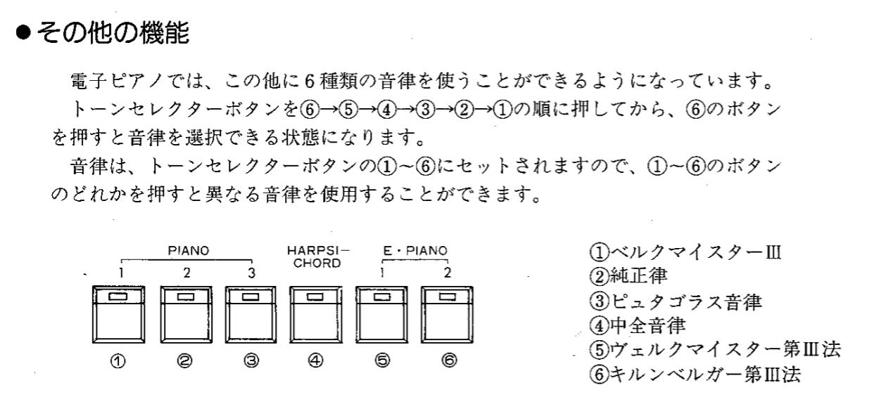 電子ピアノのPT200/PM100をネットで検索すると、 取扱説明書 がKAWAIのサーバからゲット出来た。 さらに このページ (バックアップは これ )の中にある「河合楽器」というタームを検索すると、上のような懐かしい写真が出てきた。 「裏モード」の55種類はもちろん記述されていないが、以下のように「表モード」として6種類の音律が選択できるという仕様だった(ただし音律(1)と音律(5)は同じもののようなので、どうやら取扱説明書を制作したチームのミスと思われる)。