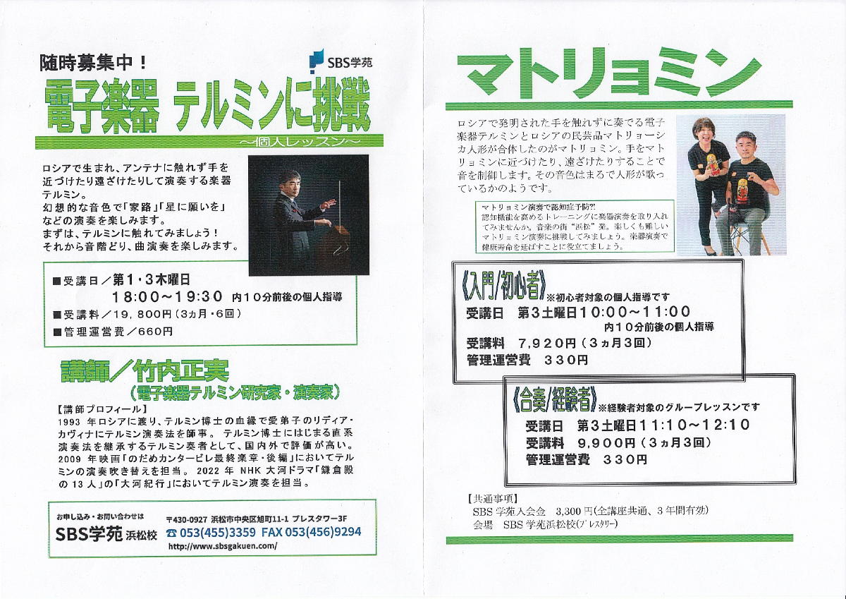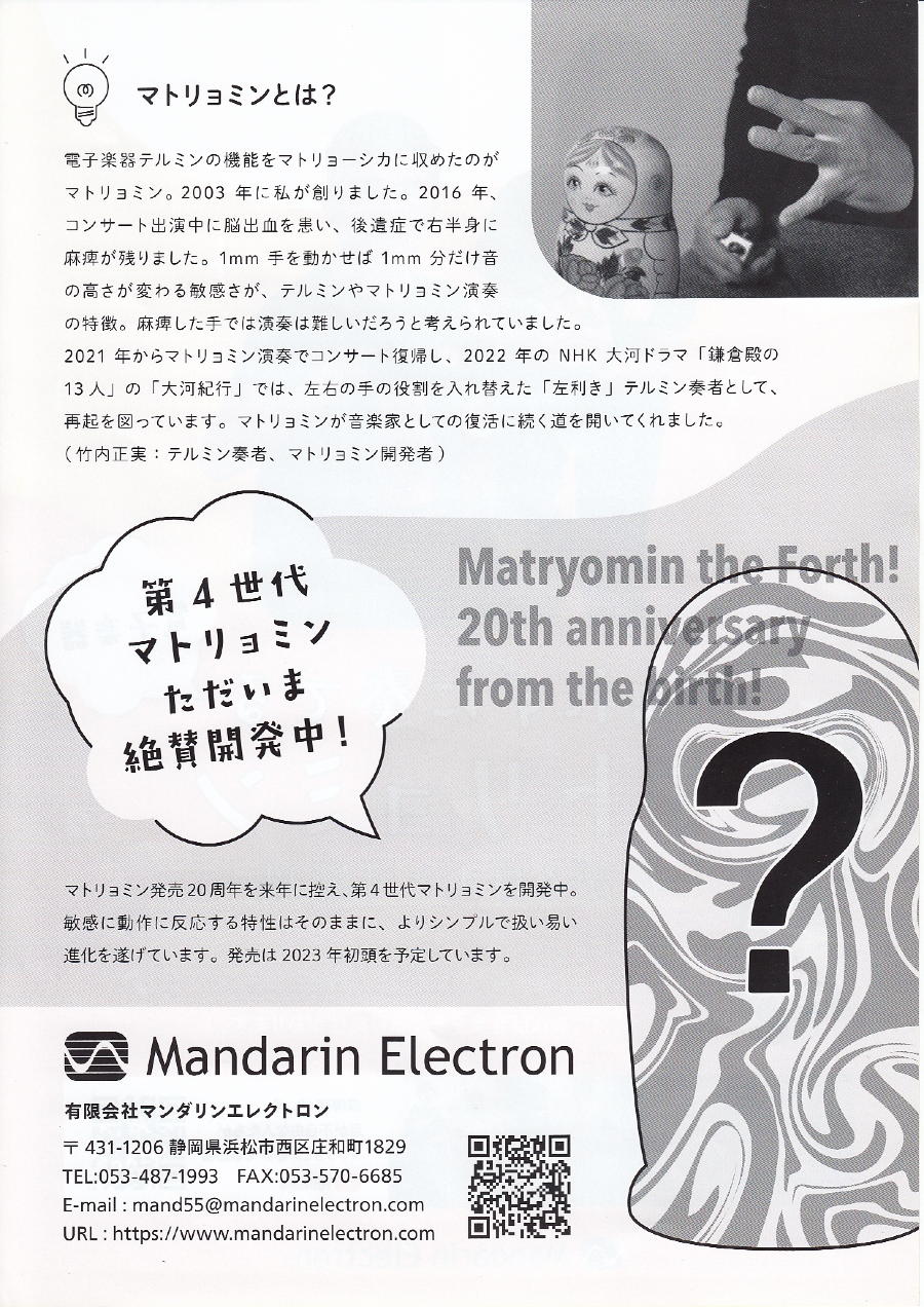 竹内さんからのOKも出たということで、日本音楽即興学会の大会に発表応募した内容は上のようなものであり、ちょっとタイトルが「敢えてダサい」のだが、これは本当に敢えてなのだ。 これまでネーミングで「昭和」だの「平成」だのを付ける、というのは毛頭思いつかなかったのだが、何故か「Reiwa」というのはもしかして後に英語版にしても通用するような言葉の響きがあるのと、「テルミン誕生から1世紀以上」・「まさに温故知新」というあたりが、どうもこのタイトルを思い付いた原動力のようで、かねて学生によく言ってきた「作品の構想時からネーミング/タイトルは重要。おいおいそれに引っ張られてデザインが進むよ」というのを、自分にも適用する感じとなった。令和Thereminプロジェクト 音楽に興味があれば誰でも知っている「テルミン」という楽器が発明されてから1世紀以上が経過した。「触れない楽器」テルミンとは、アンテナと人間の手との距離 (電気的には静電誘導)に応じた連続的なピッチを鳴らす単音楽器であり、Moog社の本格的なものから学研「大人の科学」付録テルミンやおもちゃ的な楽器玩具まで、 多くの「そういう楽器」群を生み出してきた。30年前、御茶ノ水で買ったトランジスタ3石の安価な「イシバシテルミン」は音量コントロールも出来なかったが、現在は その半額で液晶表示付きの数十音色テルミンがAmazonから入手できる。 ロシアに渡って直系の演奏法を学んだテルミン奏者の竹内正実氏は、演奏活動だけでなくマトリューシカにテルミンを仕込んだ「マトリュミン」をアンサンブル楽器として 普及させ、289人の合奏というギネス記録を打ち立てた(2019)。竹内氏はコンサート出演中に脳出血を発症して後遺症で右半身に麻痺が残ったが、自身がリハビリを 続けながら左右の手の役割を入れ替えた「左利き」テルミン奏者として再起、マトリョミン演奏を脳卒中リハビリや認知症予防に活用する活動も進めている。 これまで多くの新楽器・生体計測インターフェースを開発してきた筆者は、竹内氏との新しいコラボレーションとして、この令和の時代にあらためて「テルミン温故知新」を 目指すプロジェクトを進めている。本発表では、大きく4つの方針 : (1)竹内氏が目指す新・マトリュミンの実験・試作開発への協力、(2)バイオフィードバック・ リハビリテーションの道具として触覚/触感センサを活用してきた発展から「触らない」意義の再発掘、(3)ウェルネス・エンタテインメントとして人間の即興性を解放する 音楽療法的ツールとしてのテルミン、(4)テルミン的な「新楽器」のための新しい音楽コンセプトの探求、について報告・議論したい。2025年1月9日(木)