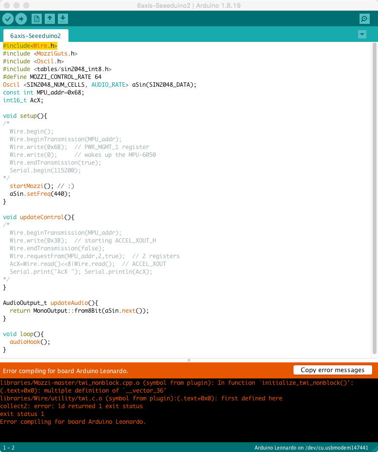 以下は音源担当 : Arduino Nano[2]のスケッチ「test114.ino」であり、素直にサイン波を鳴らすというものである。int i, pitch[5]; float mapfloat(float x, float in_min, float in_max, float out_min, float out_max){ return (x - in_min) * (out_max - out_min) / (in_max - in_min) + out_min; } void setup() { OCR0A = 1; OCR2A = 249; OCR2B = 125; OCR1A = 32767; TCCR0A = _BV(WGM00) | _BV(WGM01) | _BV(COM0A0); TCCR0B = _BV(WGM02) | _BV(CS02) | _BV(CS01); TCCR2A = _BV(COM2B1) | _BV(COM2B0) | _BV(WGM21) | _BV(WGM20); TCCR2B = _BV(WGM22) | _BV(CS22) | _BV(CS21); TCCR1A = _BV(WGM10) | _BV(WGM11) | _BV(COM1A0); TCCR1B =_BV(WGM12) | _BV(WGM13) | _BV(CS12) | _BV(CS11); for(i=2; i<4; i++) pinMode(i, OUTPUT); for(i=6; i<19; i++) pinMode(i, OUTPUT); Serial.begin(115200); } void loop() { int freq, latest; float ffreq; while(digitalRead(6)){} while(!digitalRead(6)){} OCR1A = 32767; TCNT1 = 0; while(digitalRead(6)){} latest = 10000 - (int)TCNT1; if(latest > 1360) latest = 1370; for(i=4; i>0; i--) pitch[i] = pitch[i-1]; pitch[0] = latest; freq = 0; for (i=0; i<5; i++) freq = freq + pitch[i]; freq = freq / 5; if(freq < 510) ffreq = 0.; else if(freq > 1370) ffreq = 4000.; else ffreq = mapfloat((float)freq, 510., 1370., 64., 4096.); Serial.print("ffreq = "); Serial.println(ffreq); if(ffreq < 64.0){ freq = 0; } else if(ffreq < 128.0){ freq = (int)(ffreq * 8.0) - 512; } else if(ffreq < 256.0){ freq = 0b001000000000 | ((int)(ffreq * 4.0) - 512); } else if(ffreq < 512.0){ freq = 0b010000000000 | ((int)(ffreq * 2.0) - 512); } else if(ffreq < 1024.0){ freq = 0b011000000000 | ((int) ffreq - 512); } else if(ffreq < 2048.0){ freq = 0b100000000000 | ((int)(ffreq / 2.0) - 512); } else if(ffreq < 4096.0){ freq = 0b101000000000 | ((int)(ffreq / 4.0) - 512); } else if(ffreq < 8192.0){ freq = 0b110000000000 | ((int)(ffreq / 8.0) - 512); } else { freq = 0b111000000000 | ((int)(ffreq / 16.0) - 512); } digitalWrite(2, (freq & 0b100000000000) >> 11); digitalWrite(7, (freq & 0b010000000000) >> 10); digitalWrite(8, (freq & 0b001000000000) >> 9); digitalWrite(18, (freq & 0b000100000000) >> 8); digitalWrite(10, (freq & 0b000010000000) >> 7); digitalWrite(11, (freq & 0b000001000000) >> 6); digitalWrite(12, (freq & 0b000000100000) >> 5); digitalWrite(13, (freq & 0b000000010000) >> 4); digitalWrite(14, (freq & 0b000000001000) >> 3); digitalWrite(15, (freq & 0b000000000100) >> 2); digitalWrite(16, (freq & 0b000000000010) >> 1); digitalWrite(17, (freq & 0b000000000001) ); }以下は音源担当 : Arduino Nano[2]のスケッチ「test112.ino」をこのフォーマットに改訂しつつ、デチューンのフランジャー効果でなくてオクターブ違いに重ねたものである。#include <MozziGuts.h> #include <Oscil.h> #include <tables/sin2048_int8.h> Oscil <SIN2048_NUM_CELLS, AUDIO_RATE> aSin(SIN2048_DATA); #define CONTROL_RATE 128 int i; void setup() { for(i=2; i<4; i++) pinMode(i, INPUT); for(i=7; i<9; i++) pinMode(i, INPUT); for(i=10; i<18; i++) pinMode(i, INPUT); startMozzi(CONTROL_RATE); aSin.setFreq(440); } void updateControl(){ float man, pitch; int pw, sum = 0; sum = sum | (digitalRead(2) << 11); sum = sum | (digitalRead(7) << 10); sum = sum | (digitalRead(8) << 9); sum = sum | (digitalRead(3) << 8); sum = sum | (digitalRead(10) << 7); sum = sum | (digitalRead(11) << 6); sum = sum | (digitalRead(12) << 5); sum = sum | (digitalRead(13) << 4); sum = sum | (digitalRead(14) << 3); sum = sum | (digitalRead(15) << 2); sum = sum | (digitalRead(16) << 1); sum = sum | digitalRead(17); pw = (sum >> 9) + 7; man = ((float) (sum & 0b111111111 | 0b1000000000)) / 1024.; pitch = ((float) (1 << pw)) * man; aSin.setFreq(pitch); } AudioOutput_t updateAudio(){ return MonoOutput::from8Bit(aSin.next()); } void loop(){ audioHook(); }#include <MozziGuts.h> #include <Phasor.h> Phasor <AUDIO_RATE> aPhasor1; Phasor <AUDIO_RATE> aPhasor2; #define CONTROL_RATE 128 int i; void setup() { for(i=2; i<4; i++) pinMode(i, INPUT); for(i=7; i<9; i++) pinMode(i, INPUT); for(i=10; i<18; i++) pinMode(i, INPUT); startMozzi(CONTROL_RATE); } void updateControl(){ float man, pitch; int pw, sum = 0; sum = sum | (digitalRead(2) << 11); sum = sum | (digitalRead(7) << 10); sum = sum | (digitalRead(8) << 9); sum = sum | (digitalRead(3) << 8); sum = sum | (digitalRead(10) << 7); sum = sum | (digitalRead(11) << 6); sum = sum | (digitalRead(12) << 5); sum = sum | (digitalRead(13) << 4); sum = sum | (digitalRead(14) << 3); sum = sum | (digitalRead(15) << 2); sum = sum | (digitalRead(16) << 1); sum = sum | digitalRead(17); pw = (sum >> 9) + 7; man = ((float) (sum & 0b111111111 | 0b1000000000)) / 1024.; pitch = ((float) (1 << pw)) * man / 2.; aPhasor1.setFreq(pitch); aPhasor2.setFreq(pitch * 0.5f); } AudioOutput_t updateAudio(){ char asig1 = (char)(aPhasor1.next()>>24); char asig2 = (char)(aPhasor2.next()>>24); return ((int)asig1-asig2)/2; } void loop(){ audioHook(); }