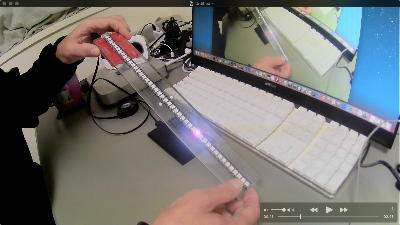 個別RGB駆動LEDテープ を使った2作目として、過去に3軸加速度センサをオンボードに取り付けたSeeeduinoLiteがあったので、これを30cmの定規に貼り付けて、「傾きをコントロールする」というシステムを作った。 この日記(RRR日記[5])の「2025年1月27日(月)」のところに YouTube動画 とArduinoスケッチが置かれているが、ちょっとイジワルなのが感覚と逆の「大きく傾けると速度が低下して、ほぼ水平に近いところでは高速で移動する」という特性である。 これを理解するとクリアできる攻略法があるのだが、そこまで行かないで飽きてしまう生徒もいる。