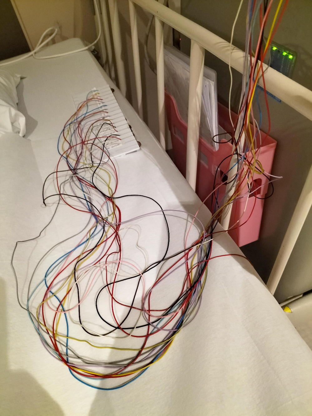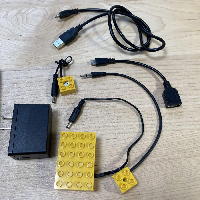 そして昼頃には このように 謎なハードウェアを1時間ほどで作って、あとは午後じゅうかかって、プログラミングに没頭した。 そしてとりあえずのバージョンが完成したところで、某バイト[2]に持参して、「ロボット教室」の生徒たちにウケた。 ウケただけでなく、まだ未完成なのだが、どのようにしたら面白くなるか、を小学生と真剣に議論した。 なんせ小学生というのは、「面白いゲームのプロ」なのだ。 これを受けて、明日からは改良のプログラミングである。