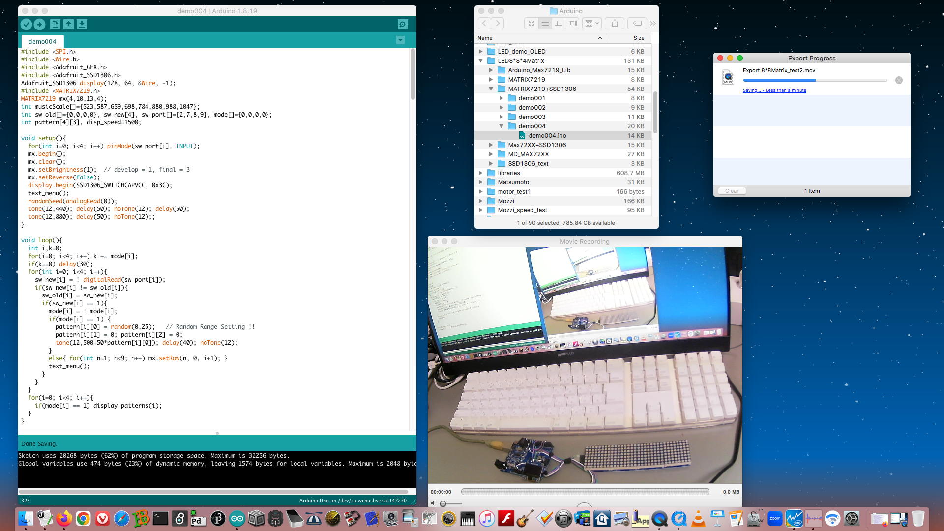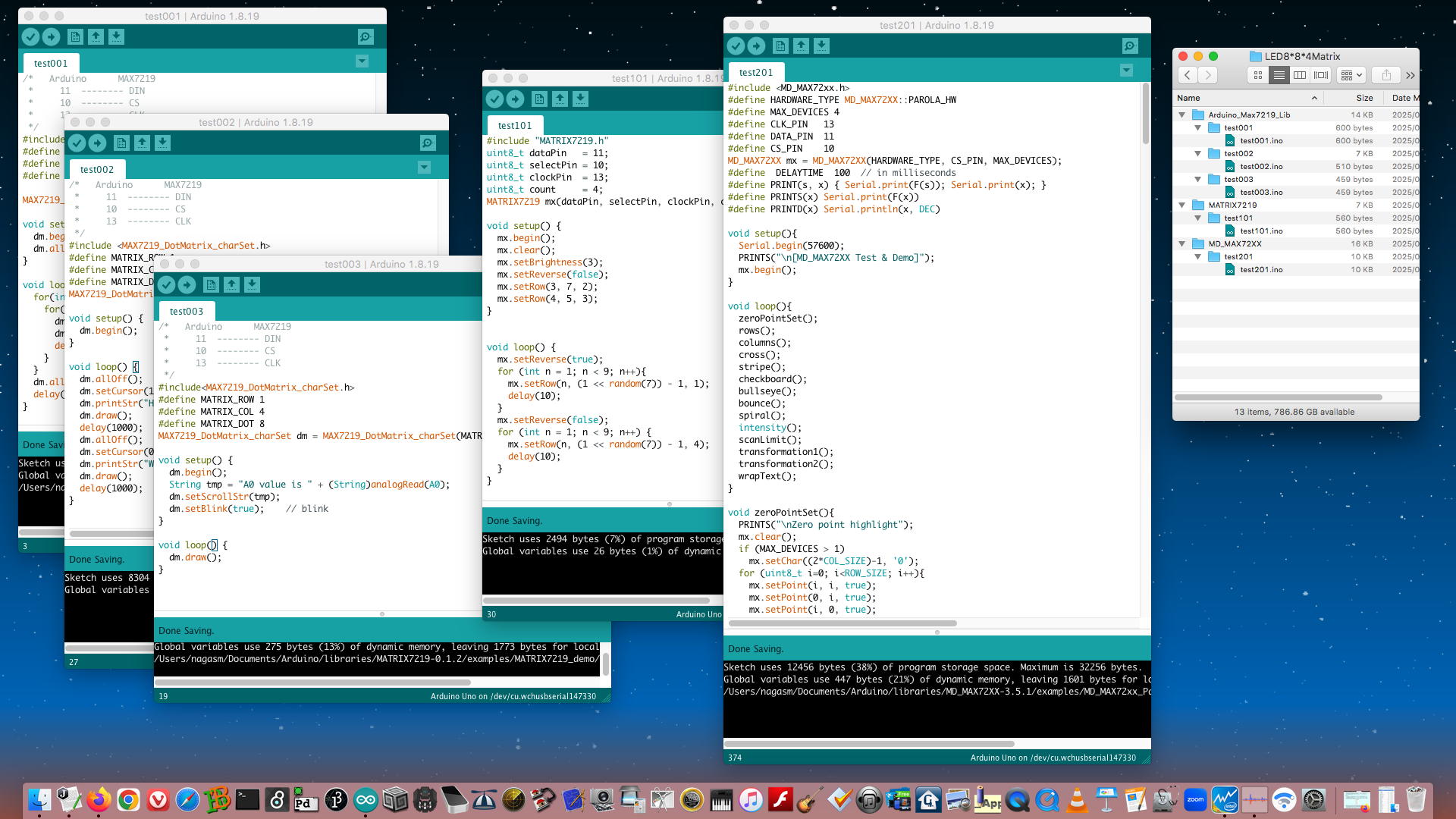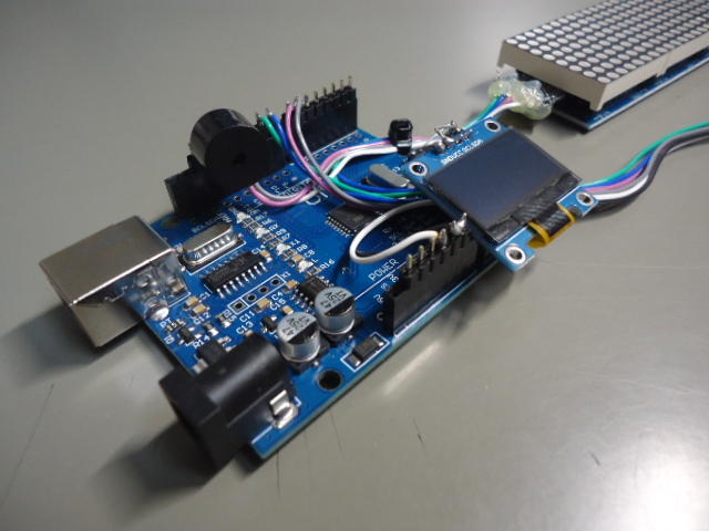ここまでで、とりあえず4種類の「SSD1306・OLEDモジュール」のサンプルプログラムが、「8*8マトリクスLED4段Max7219モジュール」と共存できる形で出揃った。 コンパイルしてみると、ArduinoUNOのメモリの65%ぐらいまでいくものと30%台のものまであり、機能と容量とで使い分けるのがbestなのだろう。 色々と実験してみたい項目が出てきたが、今日は晩に某バイト[1]もあり(中3生は明日と明後日が私立高校の入試なので激励すべし・・・と連絡が来ている)、続きは明日以降になったが、なかなか充実の一日である。