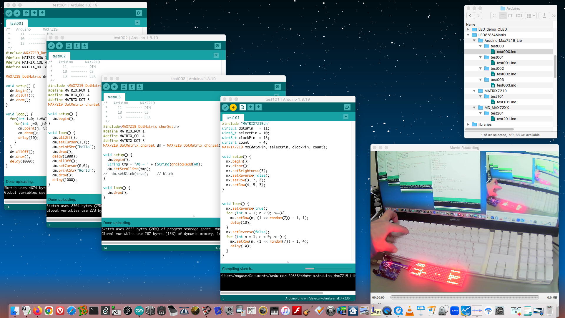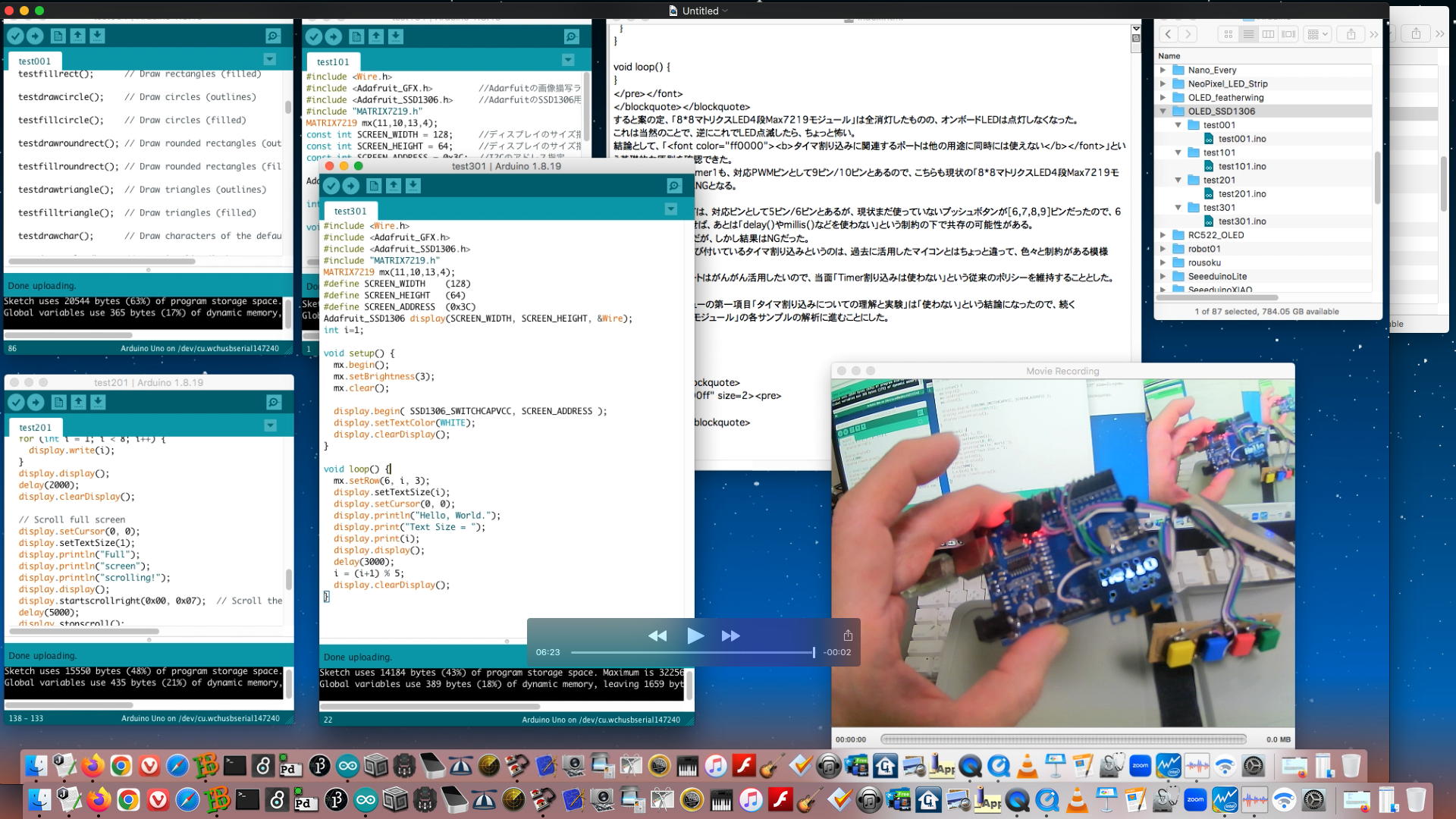 まず起点として、昨日の実験でゲットした4種類の「SSD1306・OLEDモジュール」のサンプルスケッチ「test001」・「test101」・「test201」・「test301」を上のように全てデスクトップに広げて、ちょっとOLED画面は見にくい(さらにチラチラするのは仕方ない)のだが、この順にコンバイル・アップロードして、その動作を YouTube動画 に記録してみた。