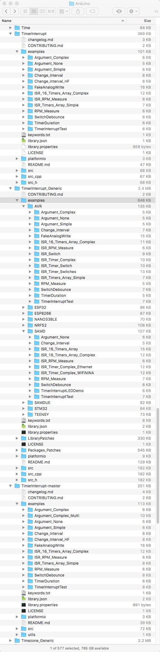 とりあえず「Arduino timer interrupt」と検索すると、いきなり本命の このページ に行き着き、該当するライブラリをダウンロード/インストールしてみると、上のように、これは最新の「TimerInterrupt-master」というものだったのだが、既に僕のArduino IDEにはほぼ同じ構成の「TimerInterrupt」というライブラリがインストールされていて、さらに別の「TimerInterrupt_Generic」という巨大なものもインストールされていて、ここではCPUタイプごとにそれぞれのexamplesが並んでいた。 この3つを共存させていると問題が起きるとすれば、最新の「TimerInterrupt-master」だけ残していけばいいのだろう。