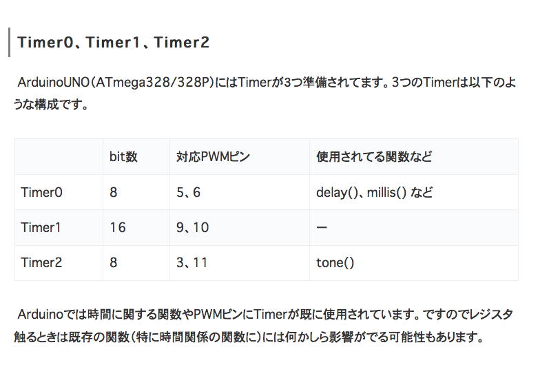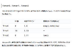 そしてさらに検索結果から、関連した「Arduinoタイマ割り込み」を解説するページとして、 解説サイト(1) とか 解説サイト(2) とか 解説サイト(3) とか 解説サイト(4) とかのページも発見した。 ところが検索の最後には日本語の Arduinoでtimerを使った割込み処理をライブラリ無しで使う方法 というページが見つかり、「ライブラリ無し」という言葉に惹かれて、まずはここから調べることにした。 結局、今日のお勉強の図式としては、以下のような順序となっていて、上から順に解決していく(→解決した場合にはその下をパス出来る)事になった。ということで、まず Arduinoでtimerを使った割込み処理をライブラリ無しで使う方法 を眺めてみた。 中身としては、アセンブラでばりばり多重の割り込みを駆使してきた僕にとっては、完全に「釈迦に説法」ものだったのでずんずん進んでいくと、以下の表が出てきた。 内部的に多数持っているタイマを外部ピンにも割り当てている(PWM出力はタイマを使っているし、考えてみればブザーも同じだった)ので、これを見ると例えば現在のArduinoシステムではブザーは12ピンとなっているが、もしtone()を使うと、ブザー出力の12ピンだけでなくTimer2の「対応PWMピン」である11ピンに影響が出る可能性がある。 11ピンをPWM出力に使うのは出来ないとしても、問題は11ピンを「8*8マトリクスLED4段Max7219モジュール」に使っているので、これが駄目となれば大きな問題となる。