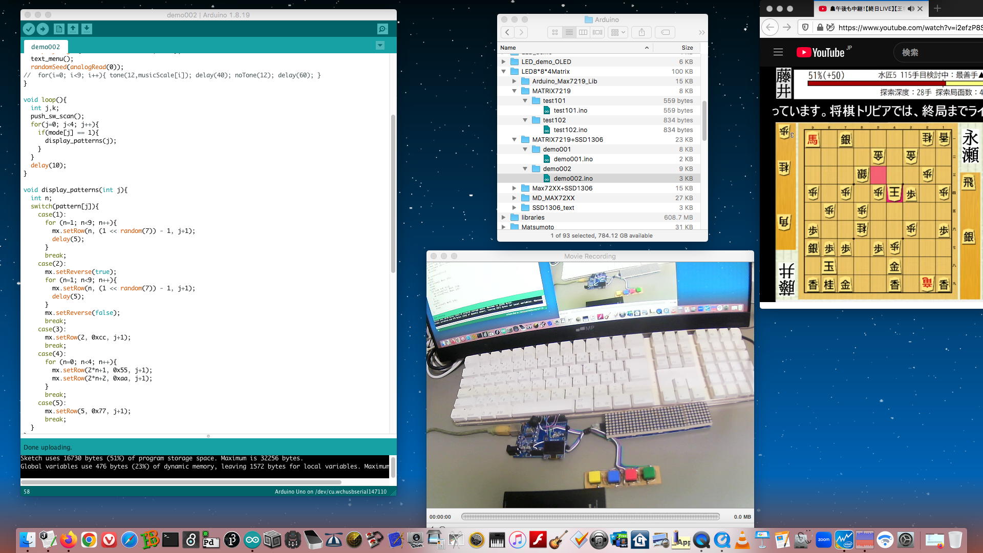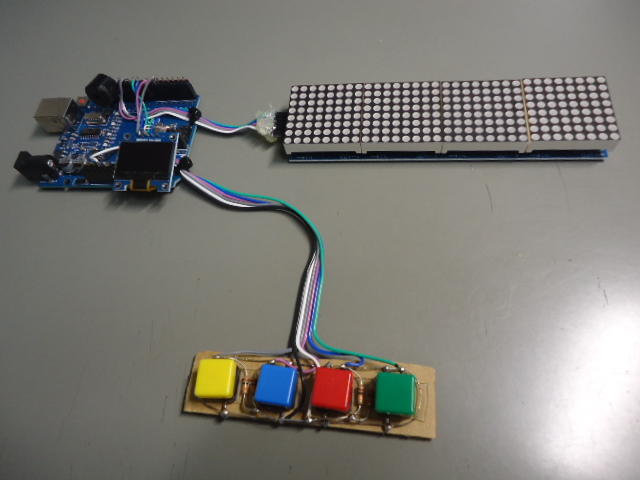 そして解説の無い静かな棋譜(このサイトはBGM[サウンド]として鳥の声だけ、という素晴らしい設定)を眺めていたが、手持ち無沙汰なので再びArduinoプログラミングを再開して、結局、まったく途上のものなのだが、一応、「スイッチに応じて何かの芸をする」という「8*8マトリクスLED4段Max7219モジュール」の雛形が出来てきた。 まだこのプログラムはdelay()を使っている(→次に改訂すべき最優先事項)ので全くダメダメなのだが、この状態でロボット教室の生徒に意見をもらって、そこから何かに仕立て上げるというのも良い作戦かもしれない。