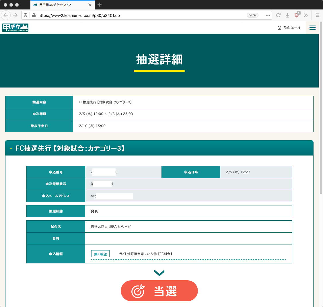 「果報は寝て待て」という言葉が現実となった。 昨日2/10は、甲子園巨人戦ライトスタンド・チケットの「ファンクラブ先行抽選申込」に先週応募していたのだが、その「FC抽選先行当落発表メール」というのが、2/10の15時から順にある、と予告されていたので待っていたのに、待てど暮らせどメイルが届かなかった。 おそらく当選から順に発信しているのでたぶん駄目で、そうなると今日2/11の「ファンクラブ先行販売(座席指定なし)」か、明日2/12の「ファンクラブ先行販売(座席指定あり)」か、その後の「一般販売」に期待するしかない・・・と諦めて寝ていた。