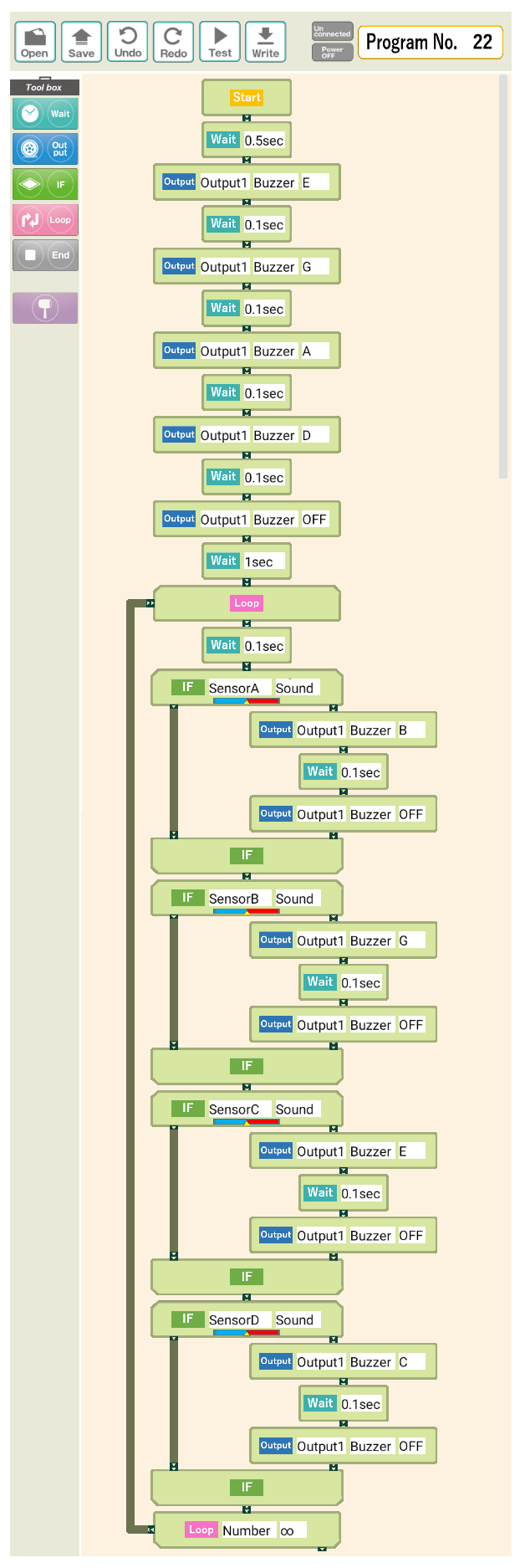 ロボット教室の「マイコンブロック」用にも、「光センサ」というパーツは1個だけ入っているのだが、光トランジスタを使った高性能な光センサがあるので、これを「マイコンブロック」用にオリジナル製作して、4個並べてそれぞれ光が当たると対応した音階(C/E/G/B)のサウンドが鳴るように作ったのがこのシステムである。 RRR日記(4) の「2024年11月12日(火)」のところに メイキング があり、 YouTube動画 も撮っていた。 教室ではこのLED懐中電灯だけでなく、「いい子は注意して使ってね」ということで他人の目に向けないという注意と共に、禁断のレーザー発光器でもビームをこの光センサに当てて、すると部屋の反対側まで移動しても反応する(レーザー光は拡散しないので到達する)という実験をやったりした。 以下がそのプログラム(専用タブレットで作った「マイコンブロック」用)である。