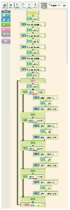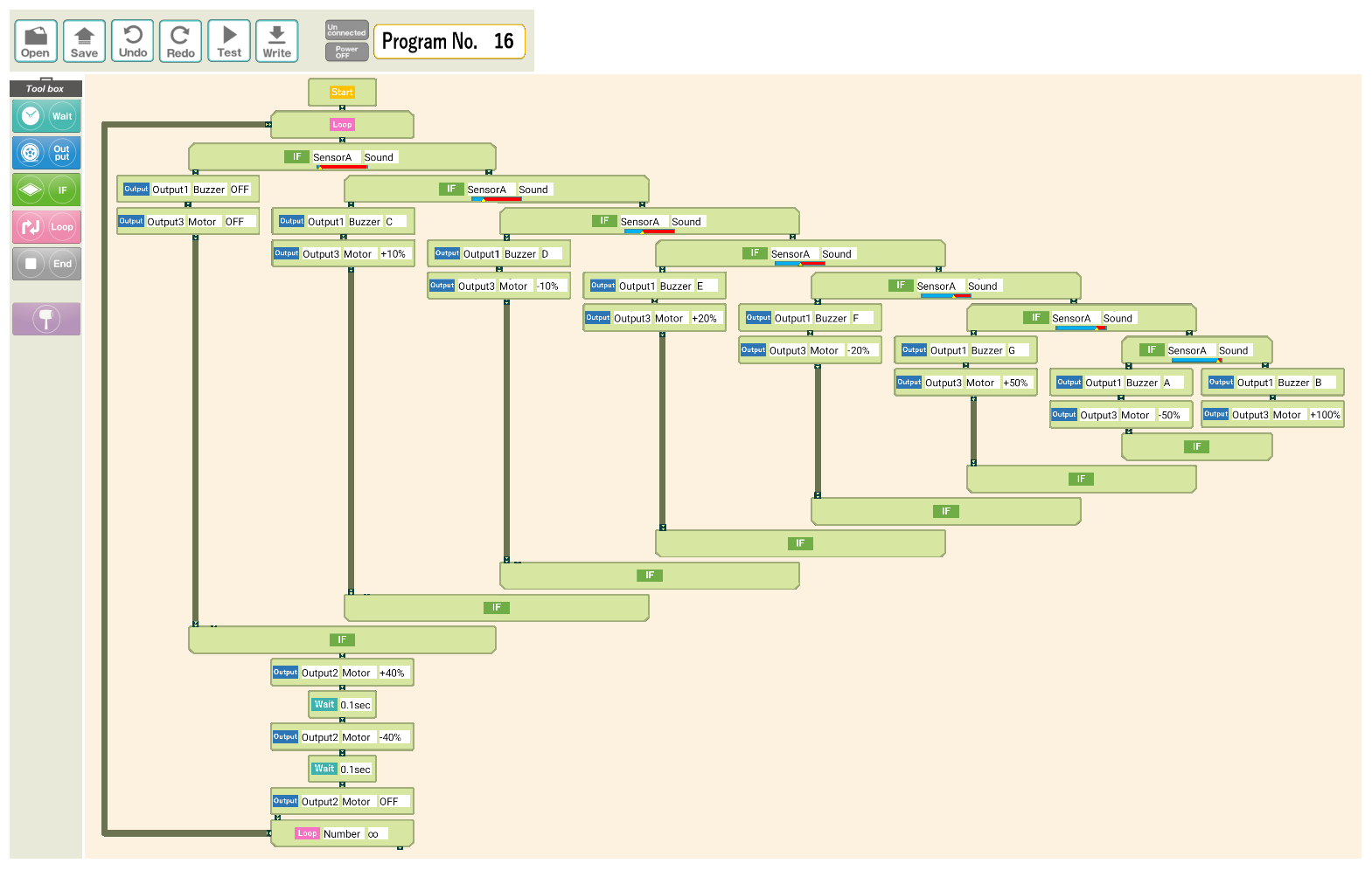 この「マイコンブロック」とオリジナルI/Oを使った作品も2つあるのだが、そのプログラムは開発用タブレット(Android)上のScratch風のものであり、内部表現されたソースコードは手に入らない。 そこで今回、スクリーンショットを撮ってMicroSDカード経由でMacに持ってきて、繋ぎ合わせて1枚の「プログラム画像」としてみたのが上の2枚である。