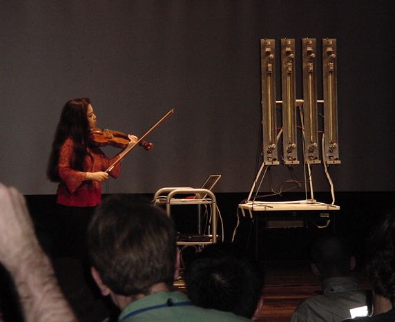 ここで思い出したのが、ニューヨークのLEMURである。 16年前の YouTube動画 を発掘したが、彼らはこの楽器ロボットをNIME2004の会場であるSUACに持ち込んで、木村まりさんの作品"GuitarBotana"の素晴らしいバイオリン即興のライヴ伴奏パートとして「伝説の名演」を行ったのだ。 この何度観てもゾクゾクする記録動画は僕の手元にあるのだが、ここに置くこともYouTubeに上げることも出来ず、これまでも講義の中でだけ学生に鑑賞させてきた。 まぁ、伝説は伝説ということで、あの場にいた人だけの伝説ということにしよう。