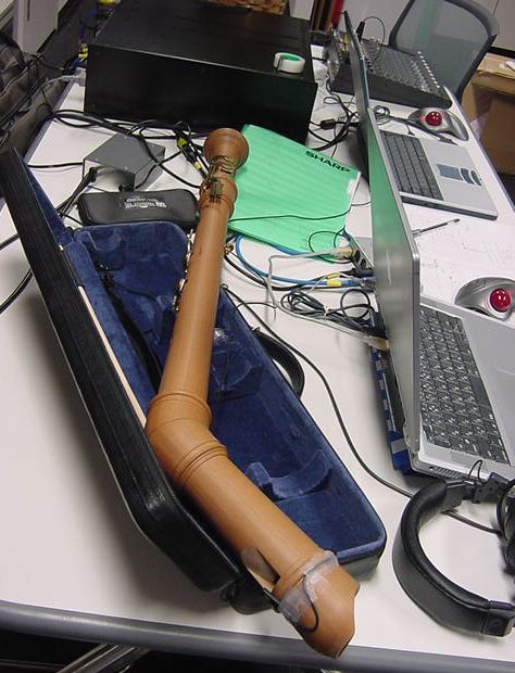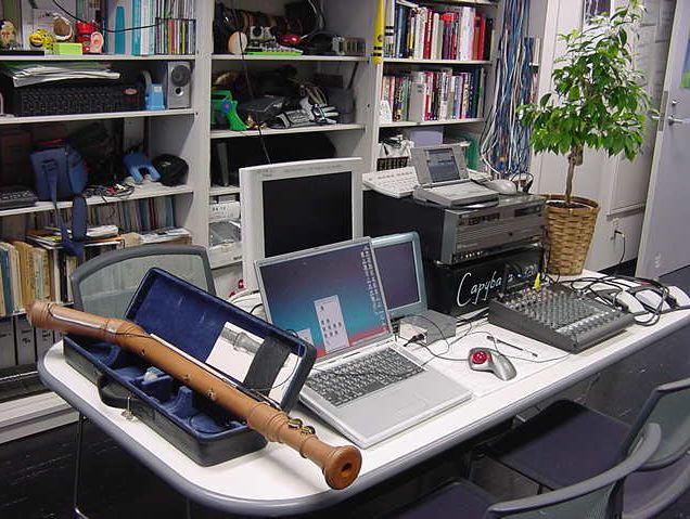 ICMCだけでなく国際会議のワークショップというのは、参加者は会場/設備などの参加費を負担する事はあっても、アカデミックなので「講師謝礼」などというものは無い。 ところがこのICMC2000では、Vorkswagen財団からの助成金が出たので講師謝礼を出す・・・と言われて、日本円でたしか18万円ぐらいのドイツマルクの札束を想定外に受け取った。 そこで「宵越しの金は持たない」ためにベルリン市内の楽器店に行って、ちょうどその全額で買えるような楽器を探してゲットしたのが、立派なBassRecorderだった(同じ楽器を浜松のヤマハでは30万円ぐらいで売っていた)。 このBassRecorderは2002年の作品 : Berlin Power として活躍することになった。 上の写真は、 Berlin Power を鋭意、作曲中の風景であり、この2002年の8月というのは、 2002年8月「あらえっさっさ」の日記 のように、とんでもない濃密な1ヶ月だったのだ。