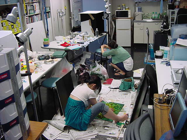 2006年は、新入生3人が志願して 第23期「虎の穴」 として研究室に通い詰めて、それぞれ「初めてのストップモーション・アニメーション」を制作した「熱い夏」だった。 その8月15日は アニメーションに挑戦(4日目) ということで、石川さんはバイトでお休み、カーマに材料の買い出しに一緒に行った岩本さんと遠藤さんが終日、アニメ作りの基礎を進めた。 上の写真の遠藤さんはこの日の塗装作業で懲りたのか、翌日からはずっとジャージでやって来るようになった。
