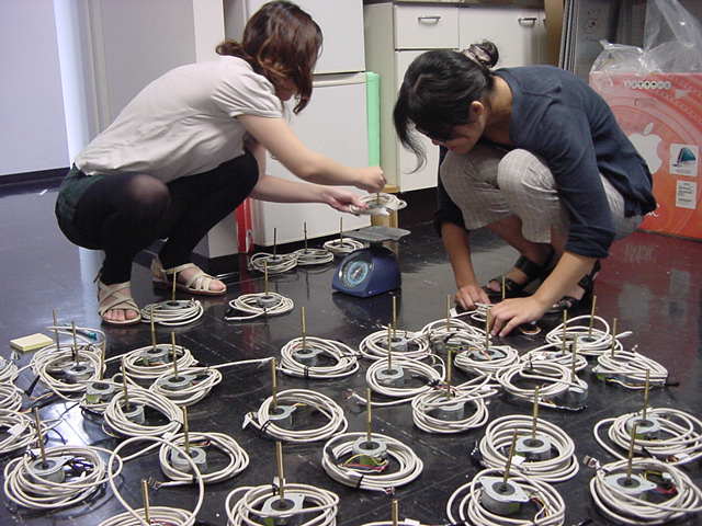 2009年には 第30期「虎の穴」 の5人が、 メディアアートフェスティバル2002 で発表する共同制作作品を鋭意、進めているところで、2日違いの上の8月13日には このように ステッピングモーター用ケーブル(全100本)の切り出し作業を進めていた。 この「30虎」は空前にして絶後の巨大プロジェクトだったが、皆んなよく頑張った。