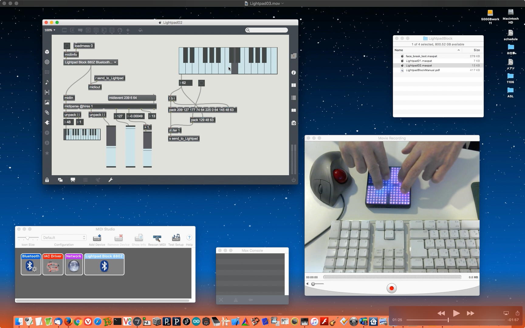 2018年には、 続・Max7日記(2) の「2018年8月15日(水)」のところに、上のようにLightpad Blockと遊んでいる写真があった。 このLightpad Blockは、 Max Summer School 2018 in 藝大 に参加して、最後のプレゼントコーナーで当たってゲットしたものだったのだが、研究室の断捨離の過程でどこかに紛れてしまって、現在では見当たらないのだった。