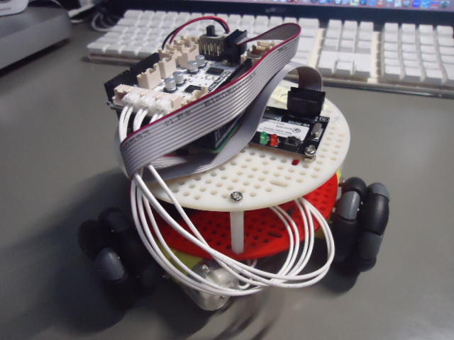 そして、予定では今週末にやる予定だった、来週のロボプロRP2の「アームロボット」に教材サンプルを、一念発起、以下のように一気に作り上げてしまった。 テキストでは、アームの台座部分に「Arduino+ロボプロシールド」の制御ベースを連結する事になっているのだが、どうしてもRP1で作ったオムニホイールロボットを分解するのが名残惜しいということで、台座の横に[モーターや8*8マトリクスLEDのケーブルを抜いた]オムニホイールロボット(Arduino+ロボプロシールド)を侍らせて、そこに4つのサーボモーターからのケーブルを挿すことにした。