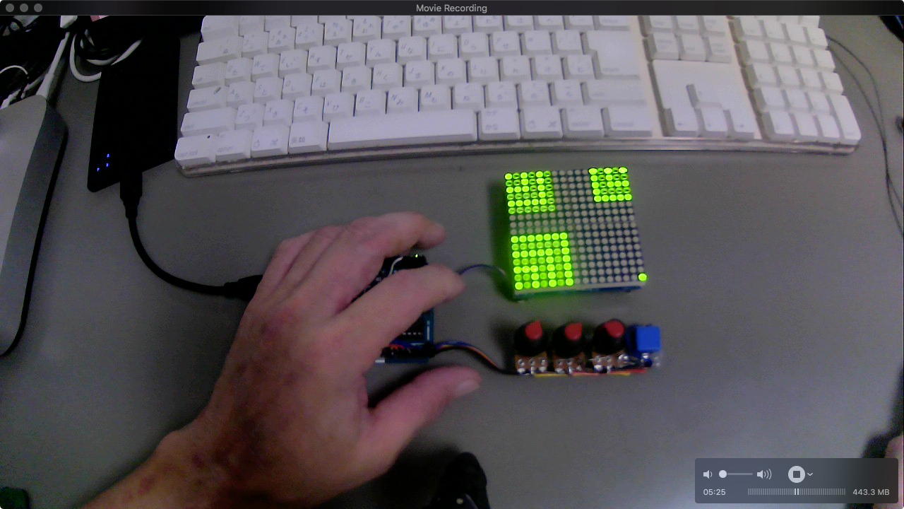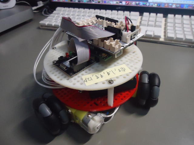 そして午後の残り時間には、この「ロボットアーム」のために「オムニホイール」ロボットをバラさないといけないので、ドットマトリクスまで載せた状態でのプログラミングをさらにちょっとだけ進めて、「操縦していない時のLED表示」と、操縦中の表示とを別にしてみた。 この改造を施した「オムニホイール」ロボットは、明後日のRP2の翌々週の回にはバラす必要があるので、あと2週間程度の命となる。 どこかで記録してみたいので、もう少しだけ「LED芸」を補充していきたいところだ。