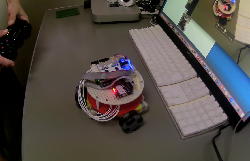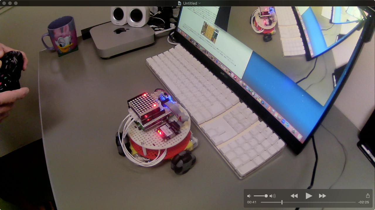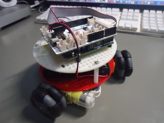 そして今日は7月のミドルコースのロボット教材作りと、あとRP2の教材作りもあった事(→バラしが必要)に気付いたのだが、昨日は「オムニホイール」ロボットを見せたものの録画する余裕が無かったので、狭いデスクの上ながら、以下のように記録を撮って、 YouTube動画 にも上げてみた。