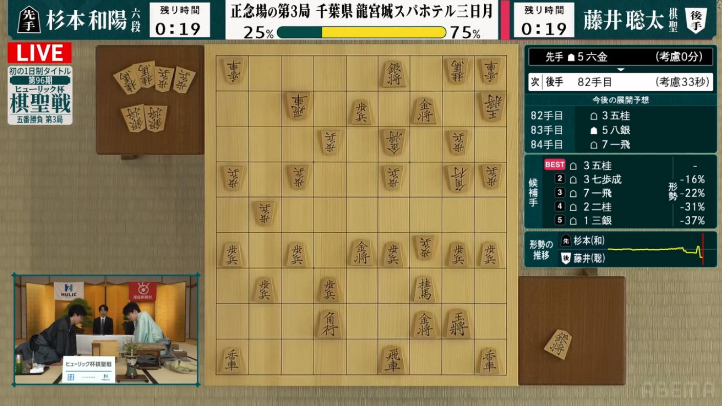 ・・・と本日オシマイのつもりで夕食となったのだが、そこで初めて気付いた(思い出した)のが、今日は棋聖戦第3局の日だった、という事実。 慌てて自室に戻ってパソコンをまた立ち上げてAbemaTVを見てみると、AI評価値曲線もかなりドタバタしつつの終盤の乱戦となっていた。 おぉぉまだまだ続く・・・と思われていたのに、急転直下、84手で終局してしまった。 いやいや、なんとも、藤井棋聖、恐るべしなのだった。