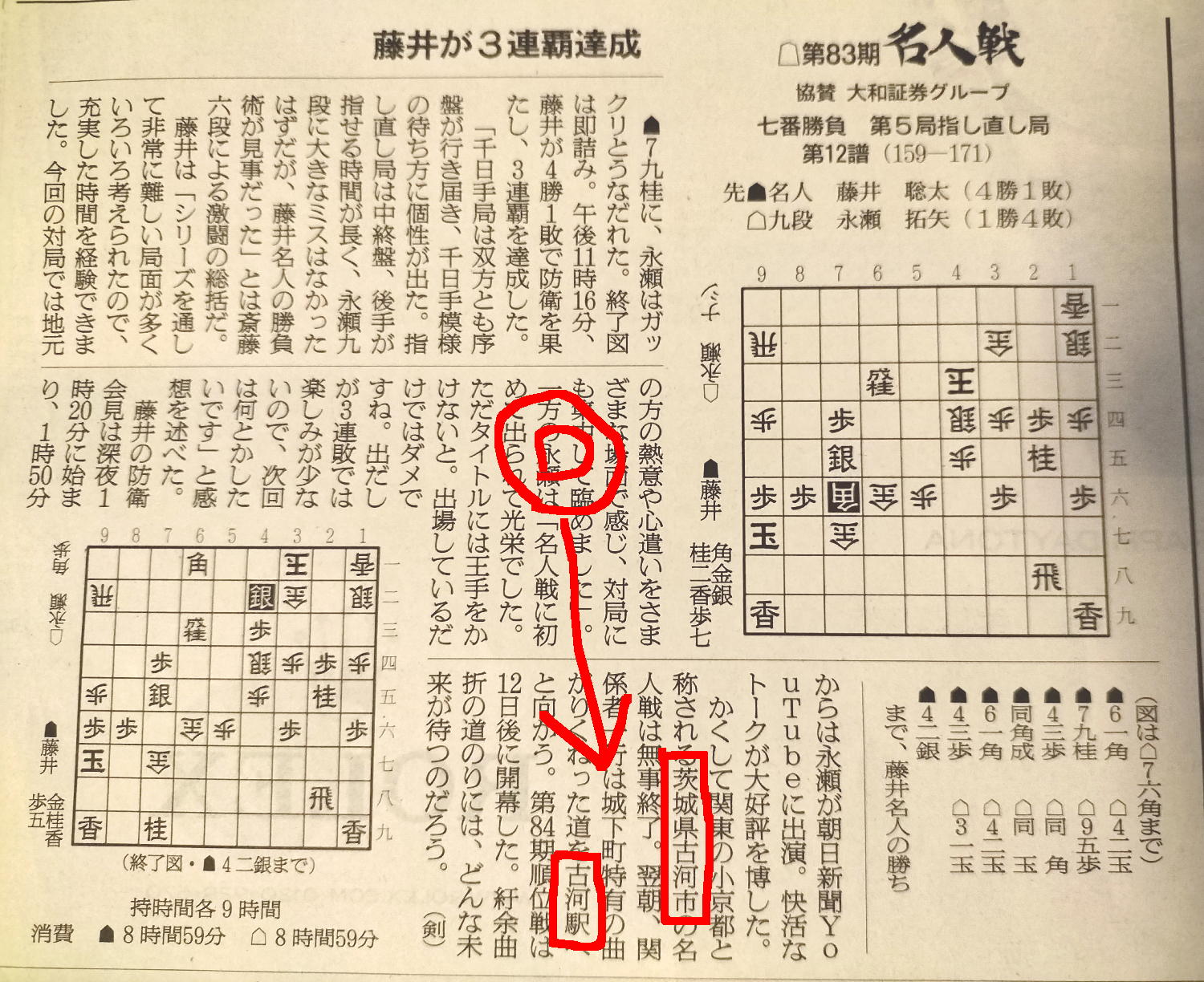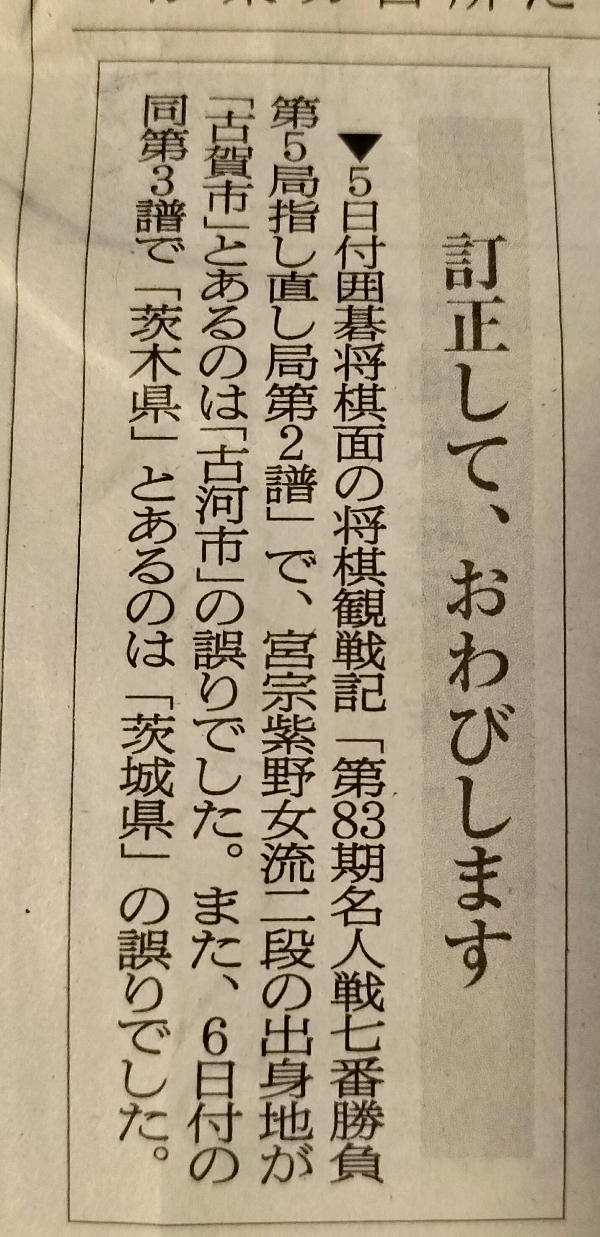 今朝の朝日新聞には驚いた。 上の「古賀市」というのに違和感を覚えて思い出してみると、これは「古河市」の誤記だったのだ。 名人戦というのは朝日新聞と毎日新聞が主催していて、その誌面で名人戦の観戦記を書いているのだから、いわばホーム中のホームである。 そして第5局の茨城県古河市は、僕も この日記のPart7 の「2025年5月29日(木)」のところにも書いていた。 この開催地の古河市は、 このように 熱烈に歓迎したというのが話題になっていたのだ。 それを主催者である朝日新聞の記者、それも将棋観戦記担当者が誤記するとは、なんという失敗だろう。 伝説の珊瑚写真でも購読を続けたものの、「ののちゃん掲載が終わったら購読を辞める」とずっと前から決めているのだが、この失敗はいただけないなぁ。
