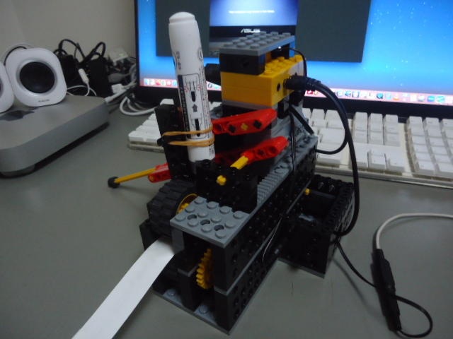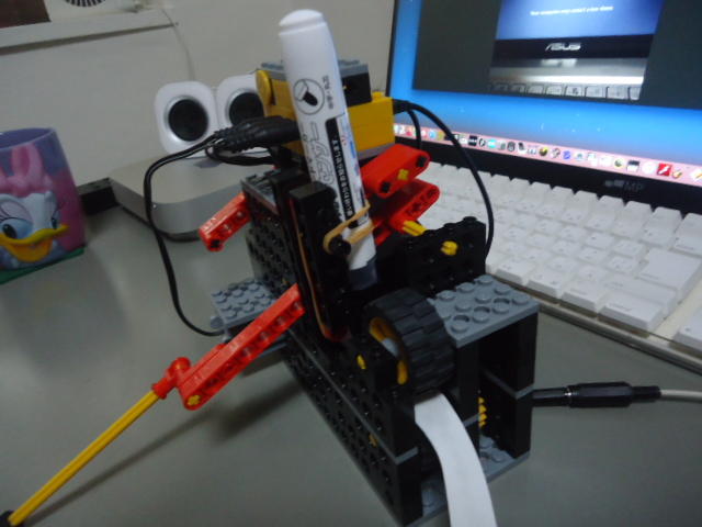さらに調子が出てきたので、日曜日に2回目が終わっていたAdvanceのロボットを、3回目に向けて改造してみた。 このロボットは、1回目には YouTube動画 に上げていたように、「スイッチONで叩く」ものだったのをも2回目には「光センサでドットをなぞって叩く」というように改造していた。 それを3回目には、ドット楽譜のテープを自動送りして自動演奏するようになったのだが、例によって光センサの閾値の問題があったり、楽譜テープの紙送りの所でヘンなところに行ってしまったり・・・と問題が頻出した。