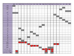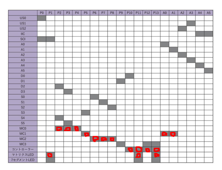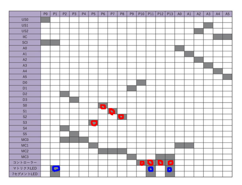 そこから、この日記の「2025年7月1日(火)」のところに書いていた「オムニホイール+8*8マトリクスLED」ロボット(動作の様子は これ )に改良する際には、ちょっと困ったことが起きた。 本当はLEDと一緒にスピーカも付けて、動作に対応してLEDのパターンだけでなく、何かのサウンドも鳴らす構想だったのだ。 ところが、サウンド周りのライブラリを使うと、全てのプログラムがエラーとなって使えなくなり、そこで上のようにマッピングを確認してみた。 すると「コントローラー」と「マトリクスLED」とで「P11」と「P13」が重複しているのだが、何故かこれはOKだった(SPI信号でもともと時分割している?)。 その一方で、未使用なのでOKだと思って「P9」(シールド上は「D1」)にスピーカを繋いだのだが、ウンともスンとも言わなかった。 これはどうも、サウンド周りでは裏でタイマ割り込みを使うために、その設定レジスタとかで「使用禁止ピン」がある・・・というのを以前に調べたところだった。 結局、サウンドとの同時動作は却下ということになったのである。