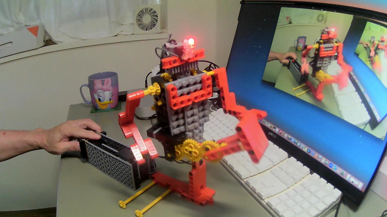 そして午後には、昨日のロボット教室(アドバンス)で3回目が終わったので、サンプル教材を「3回目」→「4回目」(上のマシン)へと作り替えた。 3回目では このように 紙テープにドットが打たれた「楽譜」をスクロールして光センサで読み込み「自動演奏」をする・・・というものだった。 今回は1回目( この日記のPart7 の「2025年5月24日(土)」のところ)にあった この動作 と自動演奏の楽譜テープ送り機構を組み合わせて、スイッチでリズムを打って叩く「腕」に水性マーカーペンを取り付けて、白紙の紙テープに「演奏タイミングでドットを打つ」という「演奏自動記録」マシンに仕立て上げる、という意欲的テーマである。