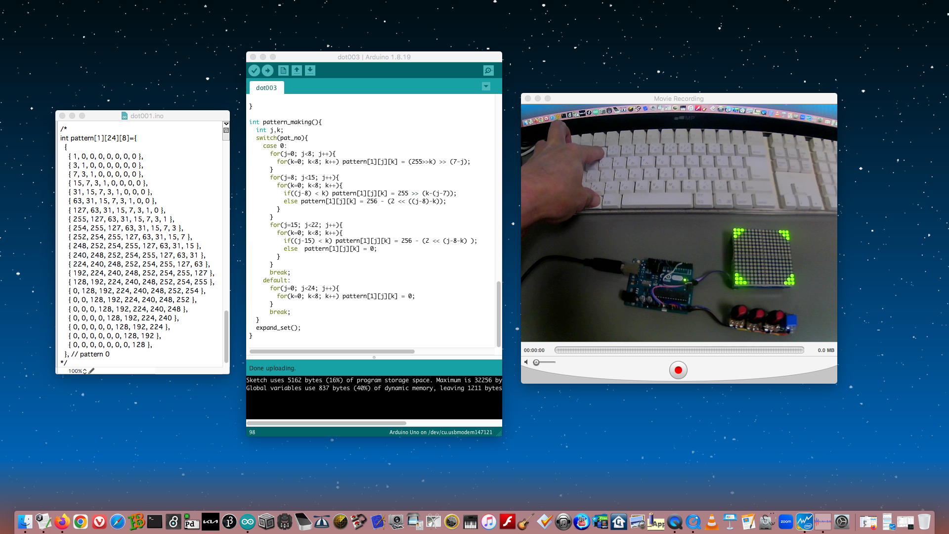 そして午前中には、「ドットマトリクスLED搭載オムニホイールロボット」を、とりあえず(1)待機中は12パターンからランダムに8stepsアニメーション(2ドット表示)、(2)動作中はその4倍の速さで1ドットをランダム表示、という仕様で上のようにfixして、 YouTube動画 にも上げてみた。