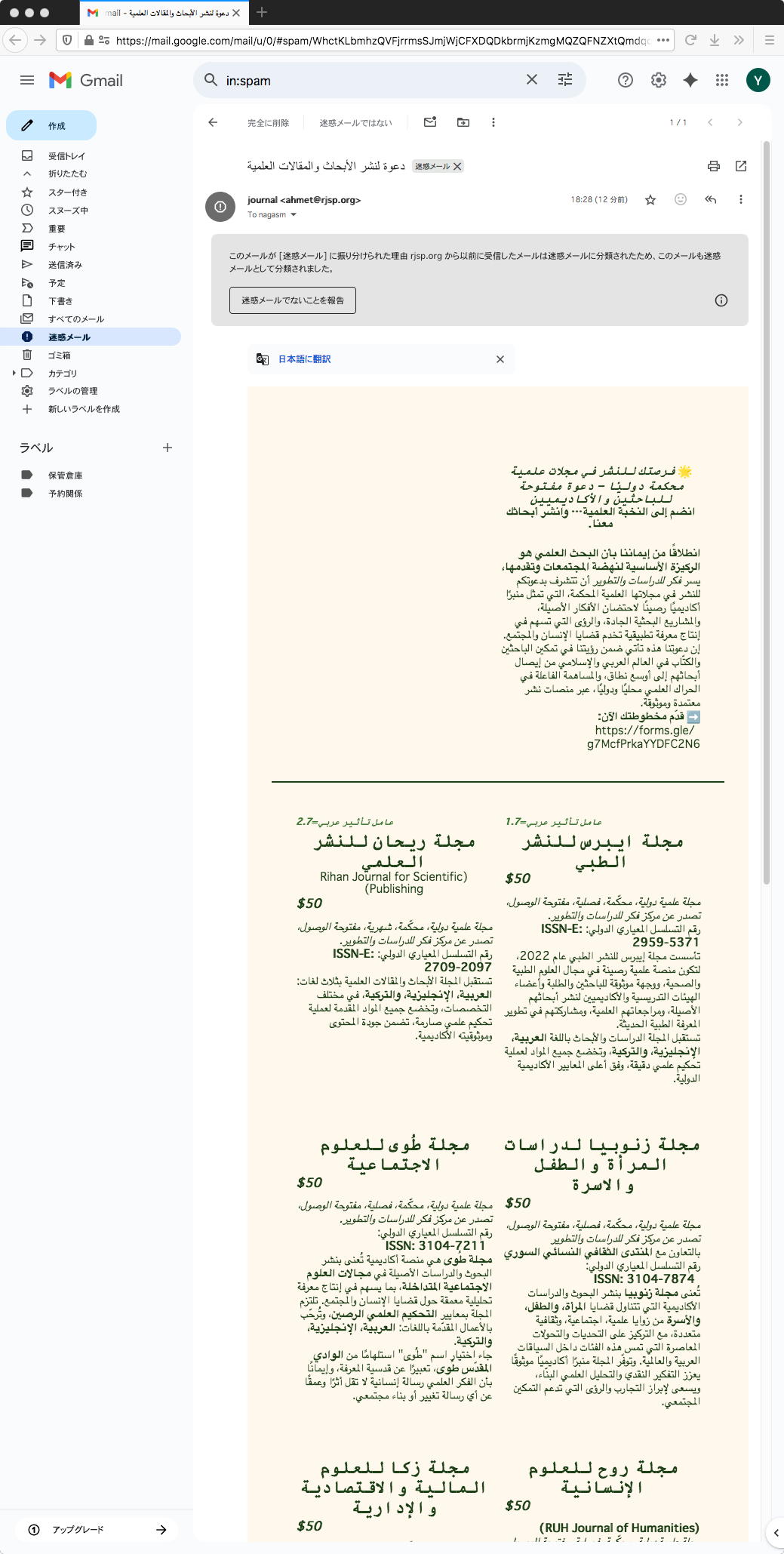 昨夜、最後のメイルチェックで届いていたのは以下のような謎のメイルだった。 「Journal」とあるので、まぁいつもの禿鷹ジャーナルなのだろうが、アラビア語?なので全く読めない。 そういえばGmailなのでGoogle翻訳で観れるかな・・・と思ったが、既に、無条件反射で(ゴミ箱でなく)「迷惑メール」消去してしまっていたので変換できなかった。 ここからのメイルは2度目らしいのだが、前回も同様に消去後に「シマッタ」と思っていたのだった。 まぁ、これだけエピソードを重ねれば、もし次の3回目が来れば「初めてのアラビア語自動翻訳」を紹介できるかもしれない。