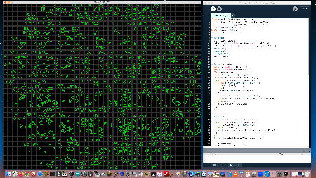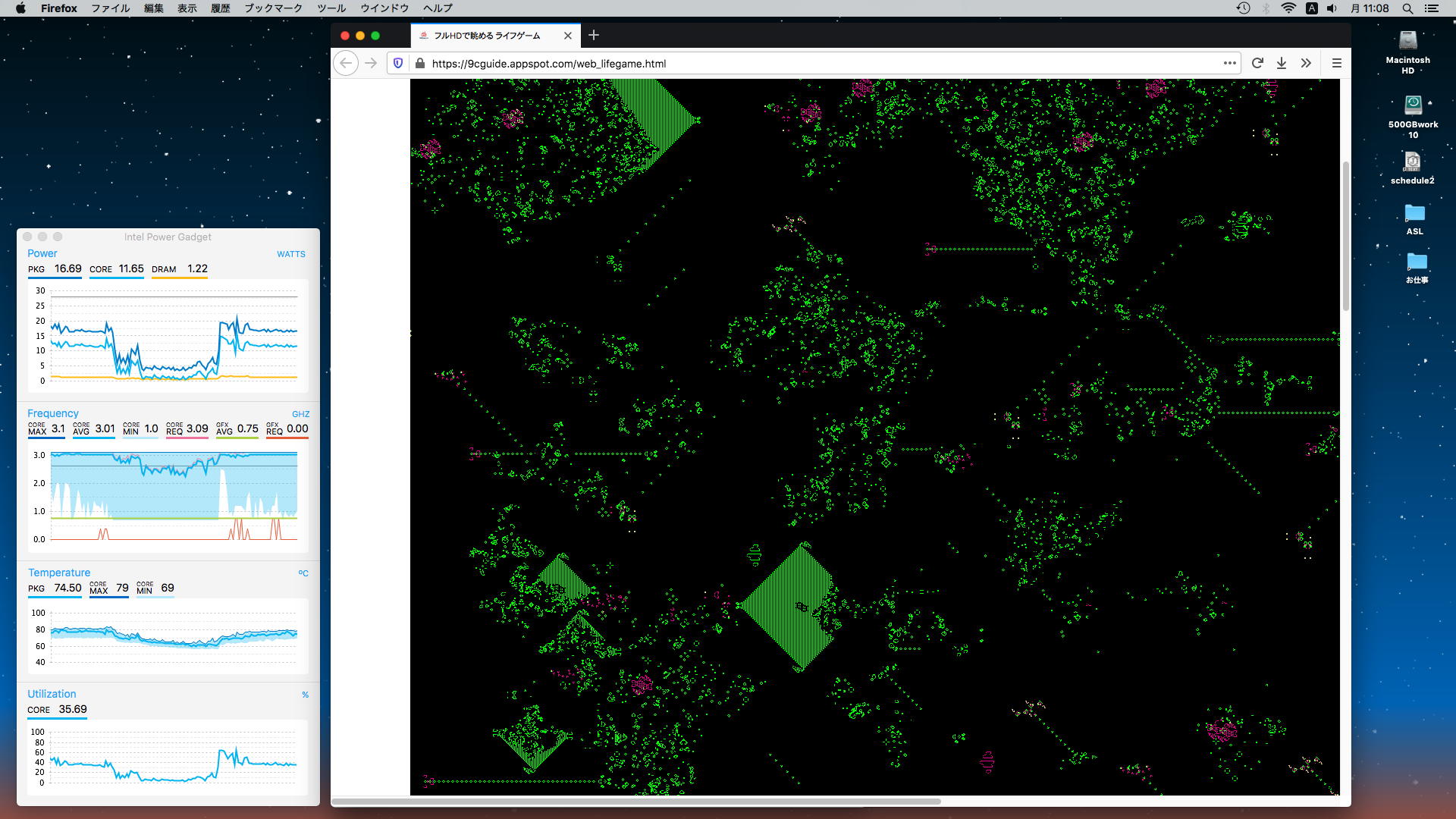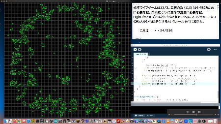 ロボット教室のRP1(1年目ロボプロ)の今月のテキストを調べてみると、来月のターム5回目には「8*8ドットマトリクスLED」の点灯サンプルとして「LIFEゲーム」を扱っている・・・と知った。 ただし、縦横8ドットでの描画にはだいぶ無理があるので、教育的にはパソコンぐらいの解像度は欲しい。 そこでネットで「life game」と検索して出てきたWeb版(ブラウザで体験できる)ものを、とりあえず以下に並べることにした。 順番は「検索で出てきた順」なので、使い勝手などの優劣とは別である。 特にちょっとユニークなのは これ で、以下のように異常に高解像度であり(CPU温度もグングン上がる)、「フルスクリーン」にも「無限モード」にも対応している。 これはかなりのこだわりである。