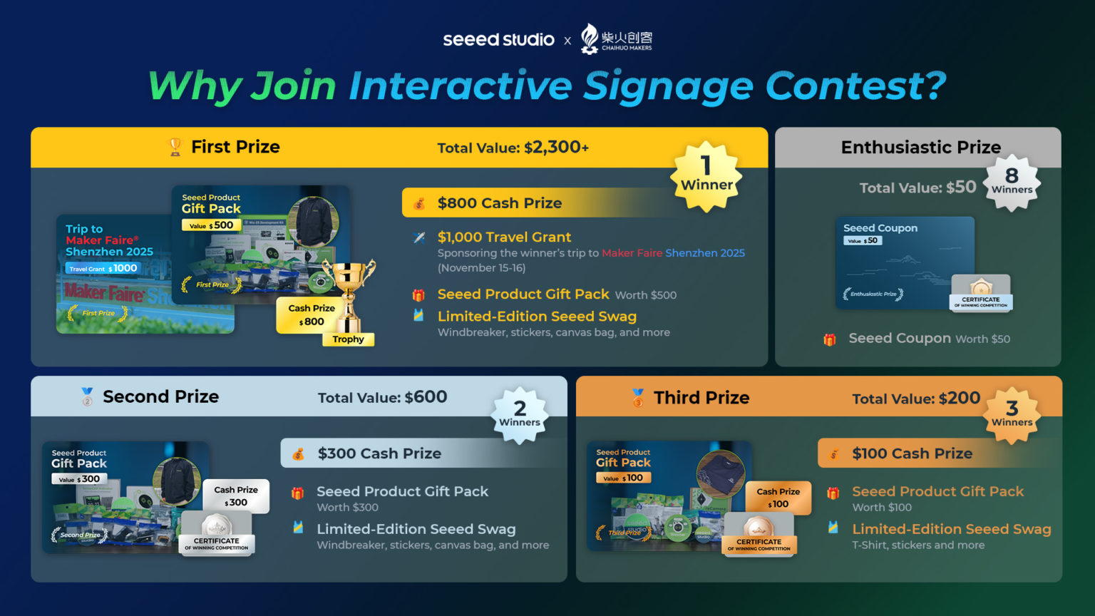 First PrizeはCashで800ドル、およそ10万円で、さらに深センで開催されるMaker Fairに参加する旅費1000ドルと、「SeeedPack」(製品詰合せ)500ドル分が提供されるという。 Second PrizeはCashで300ドルと、「SeeedPack」300ドル分が提供されるという。 Third PrizeはCashで200ドルと、「SeeedPack」100ドル分が提供されるという。 さらに8人には「Enthusiastic Prize」として「Seeed Coupon」50ドル分が提供されるという。