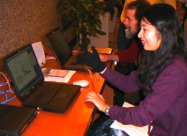 ICMC1999では、僕は前年の「笙ブレスセンサ」に関して "It's SHO time" --- An Interactive Environment for SHO(Sheng) Performance という発表、また東野さんはモントリオールで活動している梅崎さん作品の演奏者として参加した。 以下の写真で東野さんがデモ体験しているのは、IRCAMが開発した「センサグローブ」である。